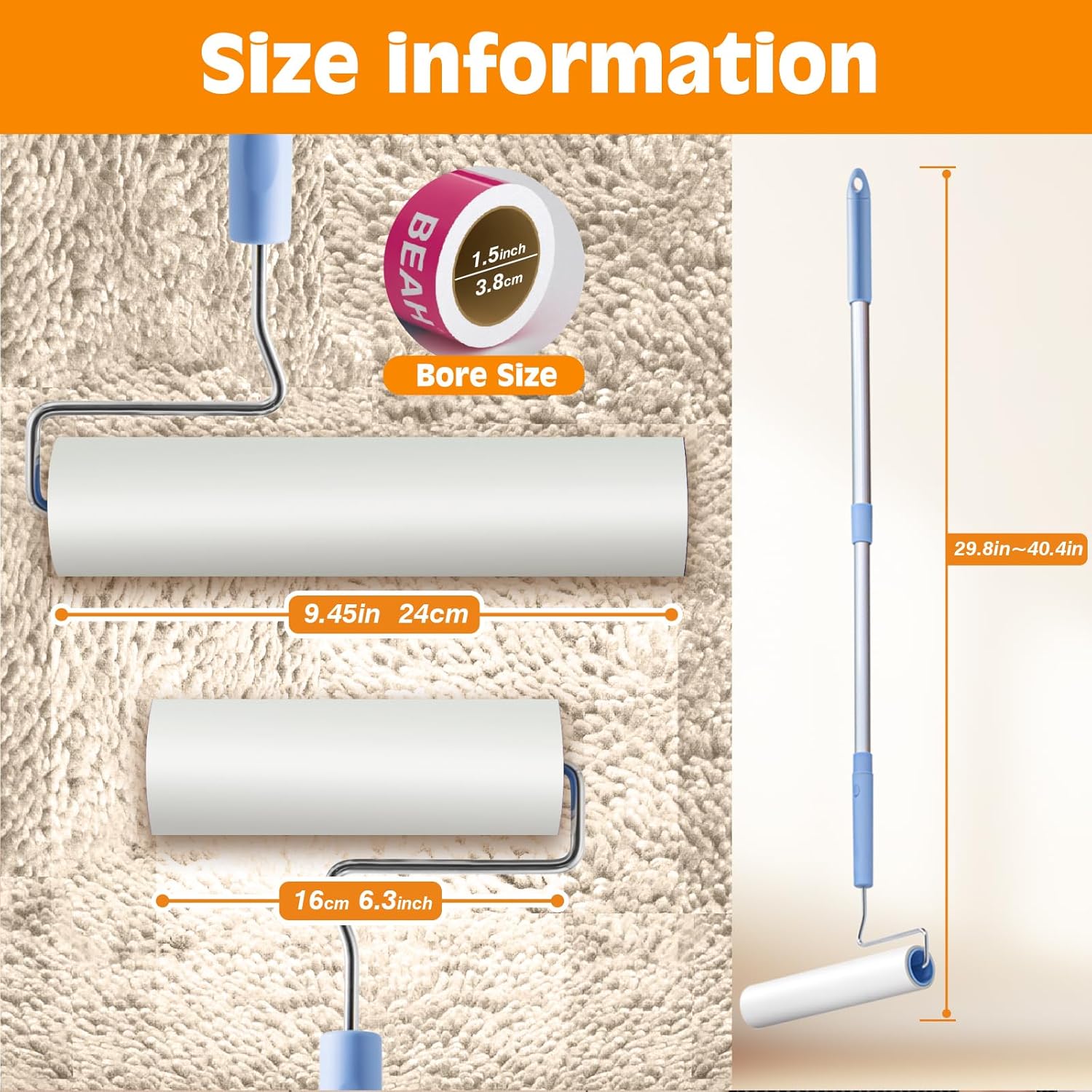 • Detachable Extendable Aluminum Alloy Handle & Dual Rollers:Durable aluminum alloy handle extends up to 40.4" to reach high spots like curtains and ceiling corners, and detaches when not needed for portable cleaning. Two roller sizes ensure versatile use—perfect for clothing, furniture, carpets, and even car seats.