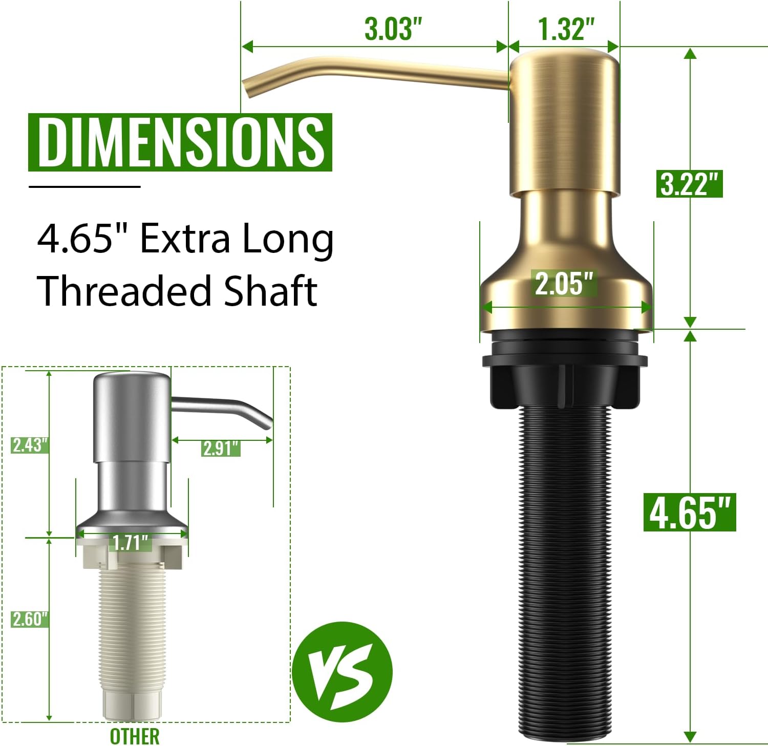 • Extra Long Threaded shank shaft:4.65 " threaded shank of soap dispenser can pass through most of deep countertops, like marble, stainless steel, wood or grantie. So it can also be used as a bathroom countertop soap dispensers. No worry about the thickness of your kitchen countertop.