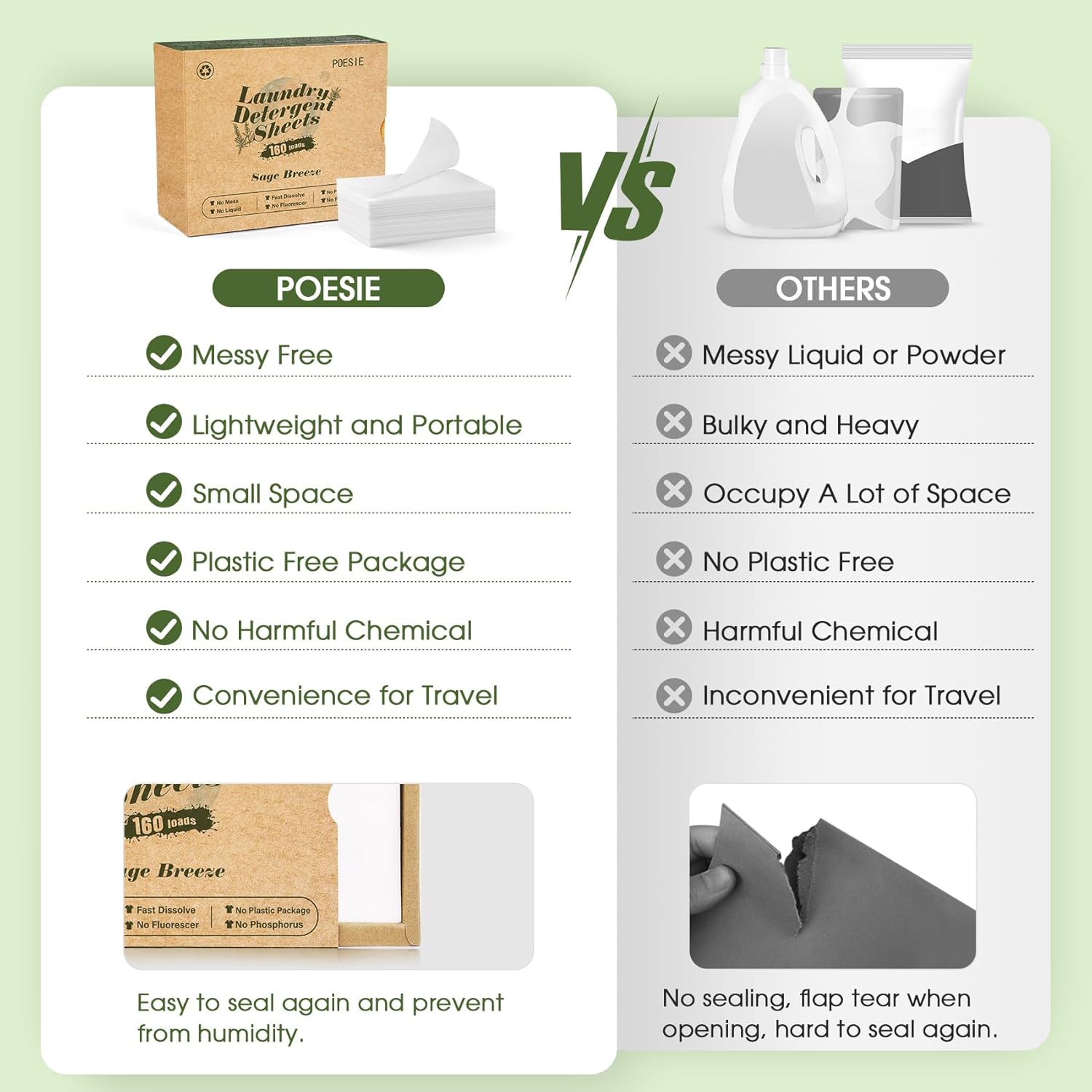 Poesie Laundry Detergent Sheet Sage Breeze Scent 160 Count Washer Sheets Detergent for Travel RV Trip Camping Home Dorm