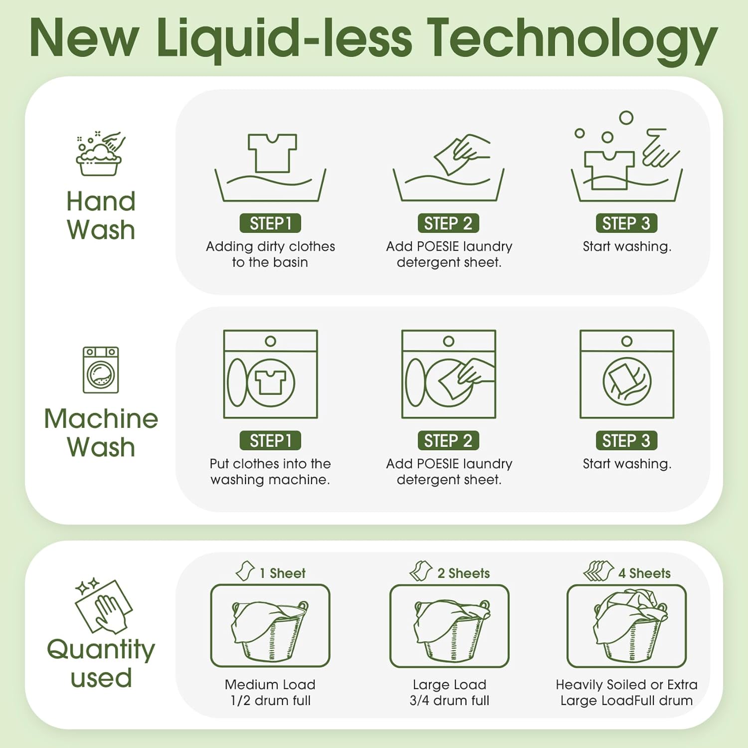 • Easy to Use - Liquidless detergent sheets, 1 sheet for small or medium loads where clothes are not very dirty, 2 sheets for large loads and 4 sheets for extra large loads, no waste. Not too little and not too much to save resources