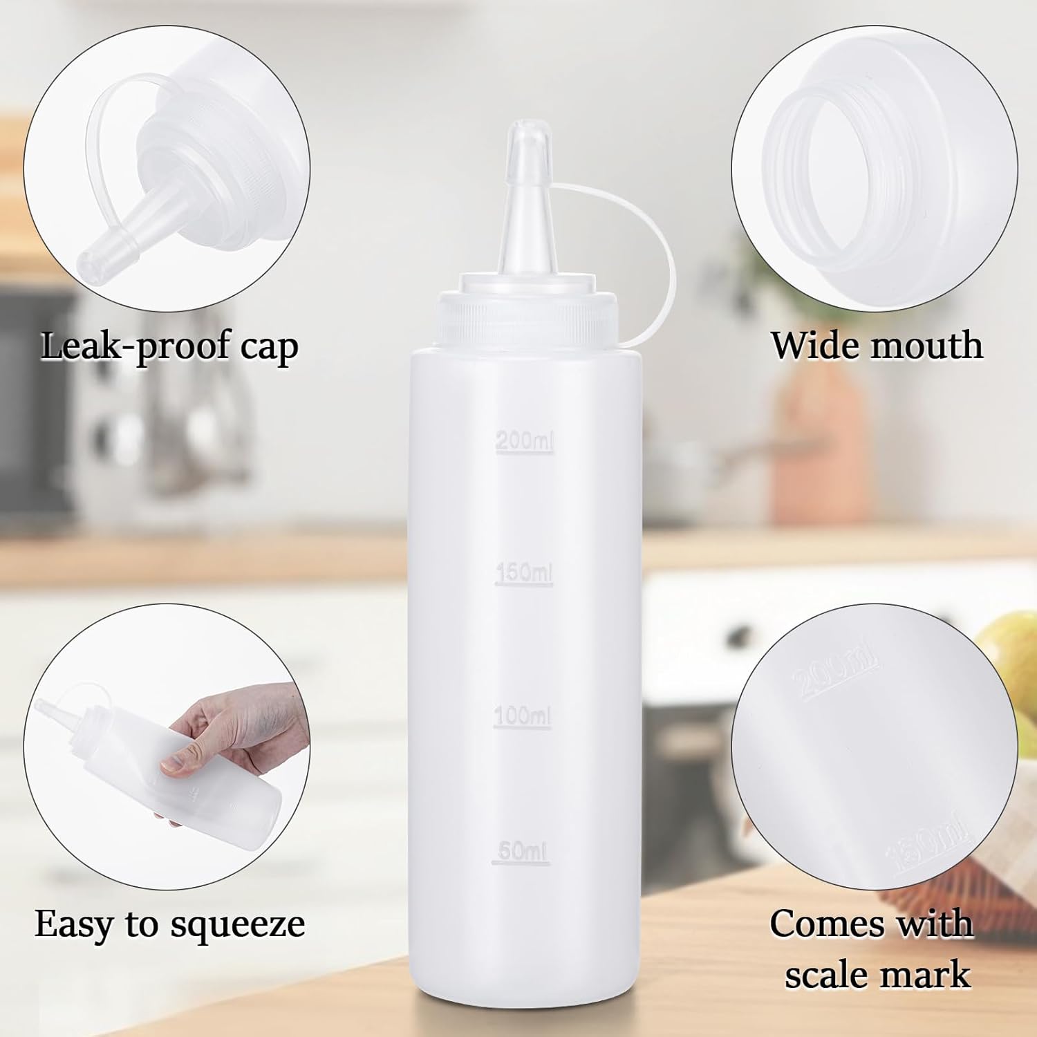 • Direct Measurements: Ketchup dispenser has a standard 100ml - 200ml scale line. By translucence plastic sauce container, you can squeeze precisely and see the capacity.ments - Condiment bottle have a standard 100ml - 200ml scale line. By translucence plastic sauce container, you can squeeze precisely and see the capacity.