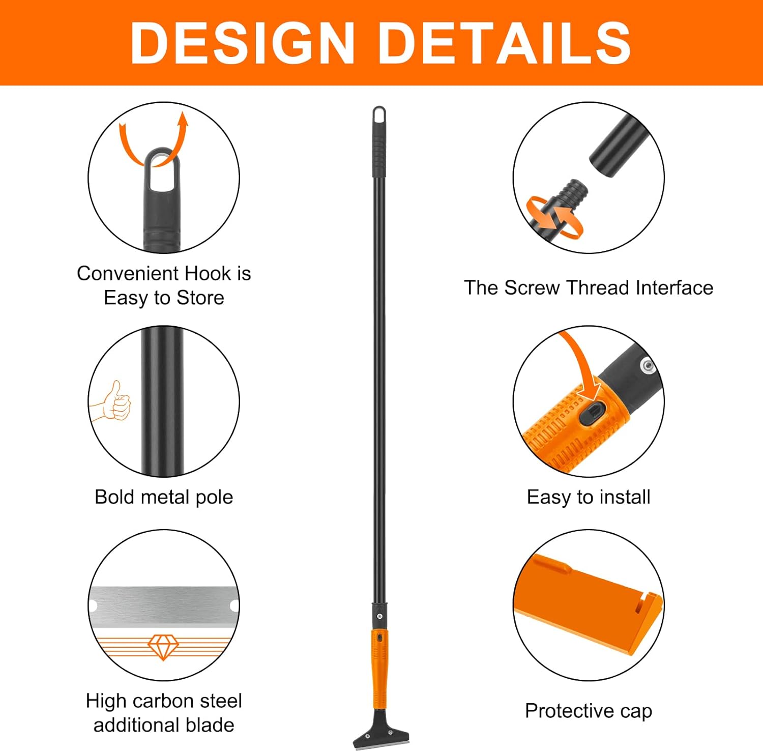 • 🌟The 4" wide blade cleans a larger area than other mini scrapers, 45.7" long handle saving effort and improving cleaning efficiency,10 replacement blades, safety cap, and screwdriver are also provided