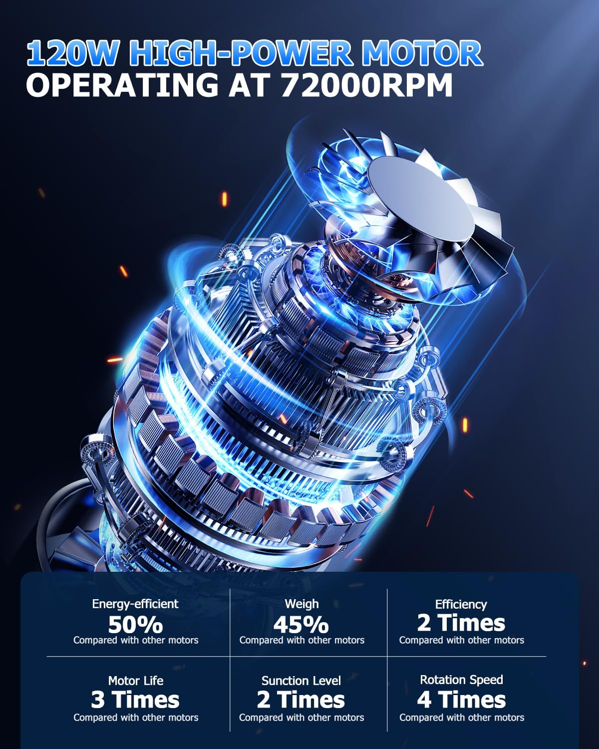 - 🌪️【16000PA Strong Suction】This handheld vacuum cordless is equipped with a high-powered motor that operates at 72,000 RPM, generating a strong suction power of up to 16,000 PA. With such suction, it easily cleans up scattered dust and debris on the floor, tangled pet hair in carpets, and stubborn dirt deep in hard-to-reach corners. Its efficient cleaning capability allows you to quickly restore a clean environment without much effort, bringing you a more comfortable living experience