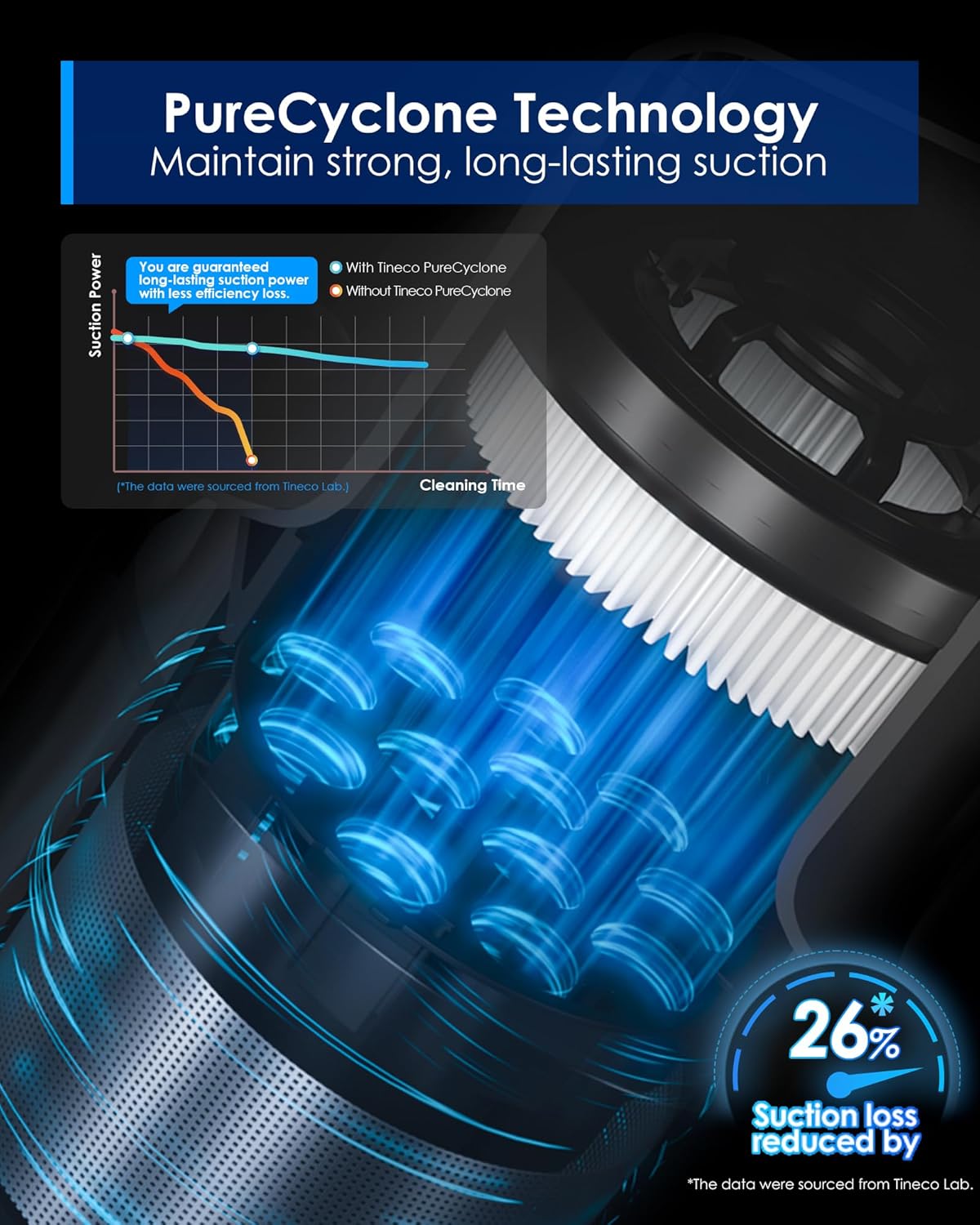 • Tineco PureCyclone Technology:Ensures strong, long-lasting suction by effectively separating air and dust, which keeps the filter cleaner for an extended period