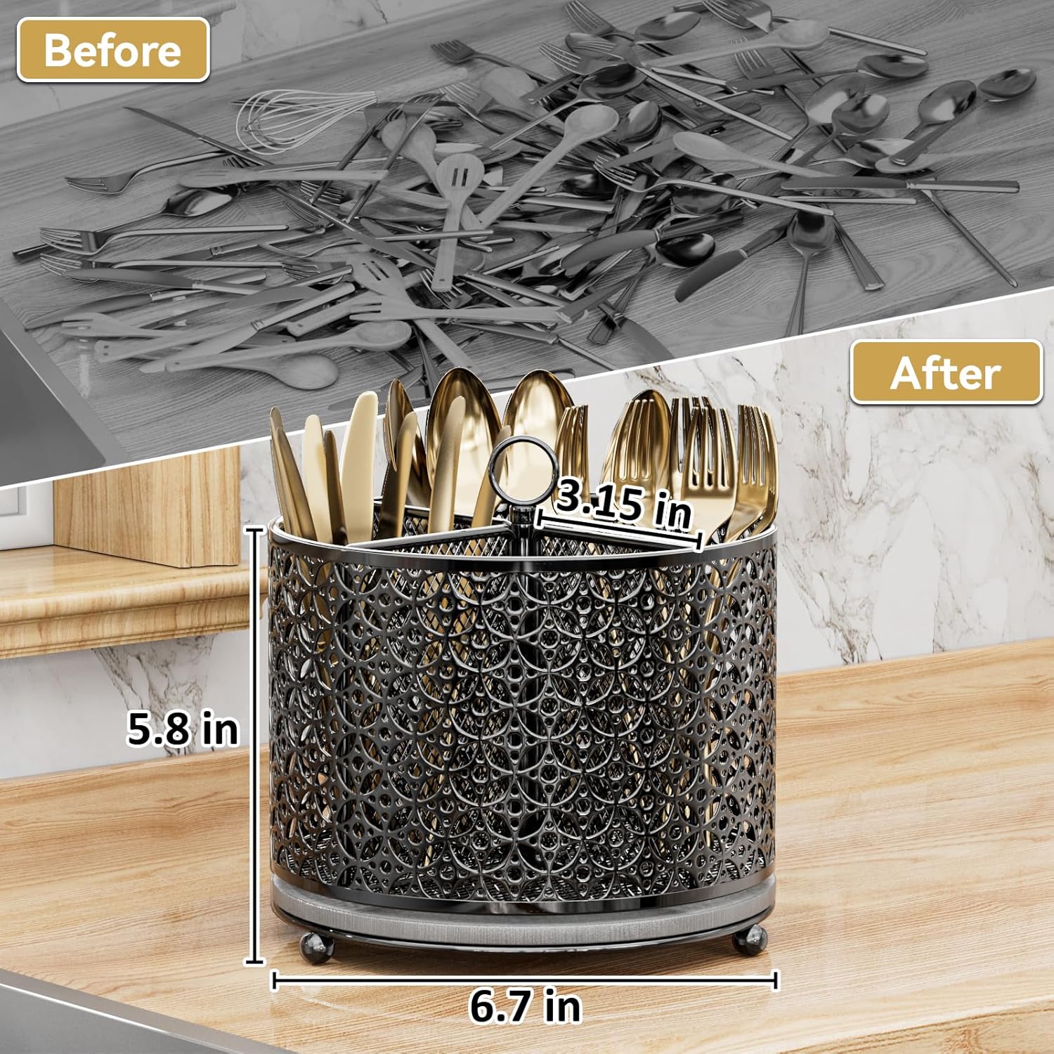 - 360°Rotating Silverware Organizer: This kitchen counter organizer offers a rotating design that makes your utensils easy to access .The rotation is smooth and effortless, adding a touch of modern functionality to your kitchen. Space-saving holder can perfectly organize your knife, forks, spoons etc. No more digging through the drawers or laying messy on the table. Just a simple spin to get what you need. Perfect utensils container for RVs, small kitchen
