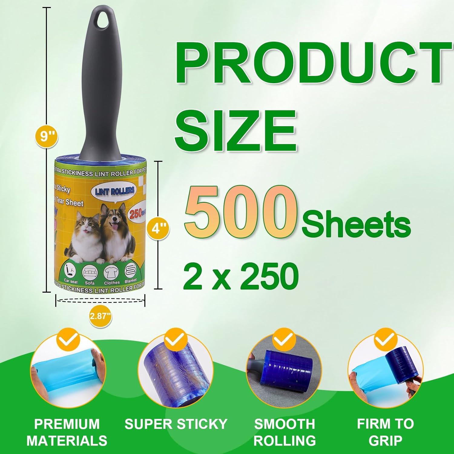 Lint Roller for Pet Hair 500 Sheets Extra Sticky Pet Hair Remover for Clothes Furniture Carpet Cleaner Cars Dogs Travel-Friendly Grip Handle Blue