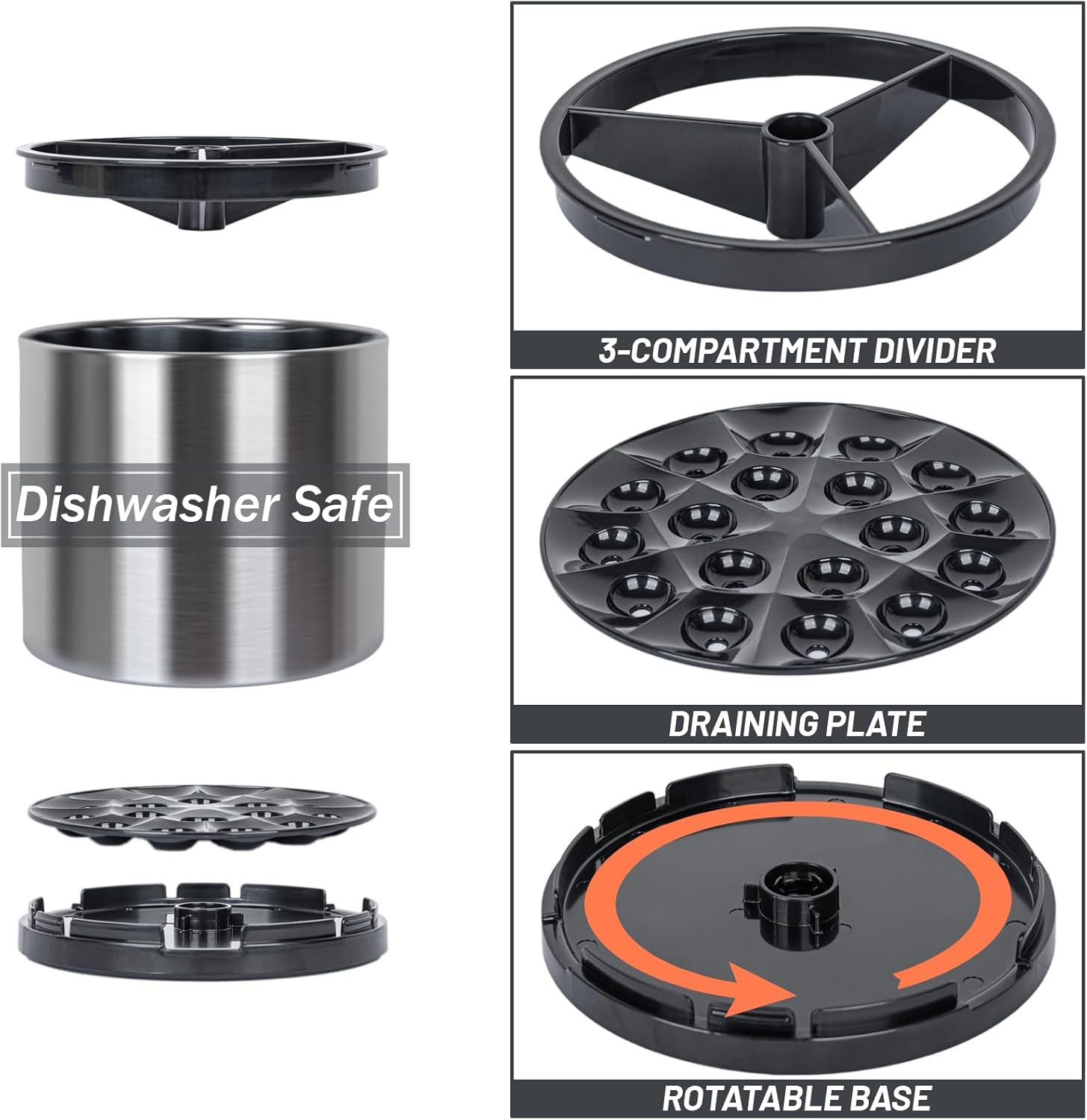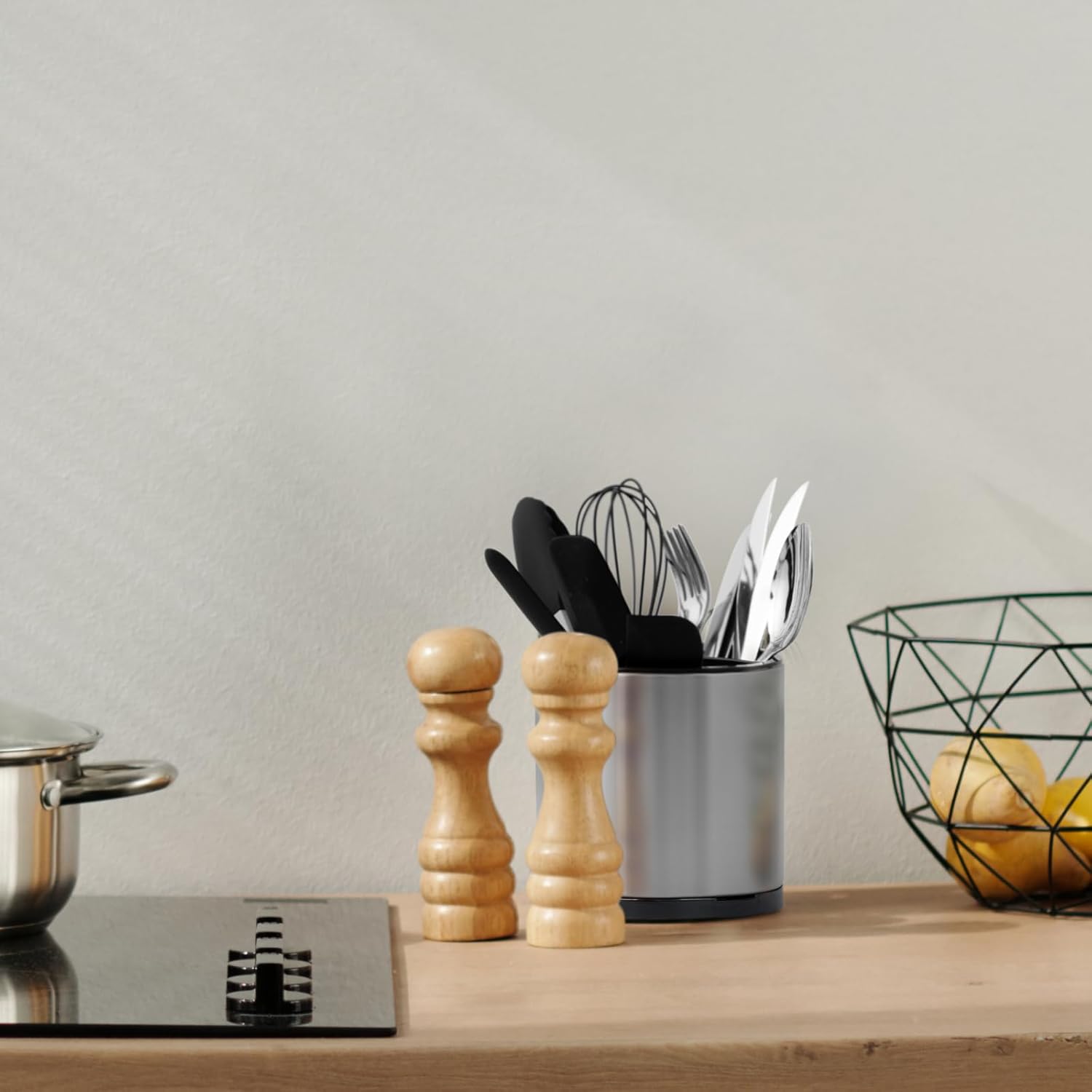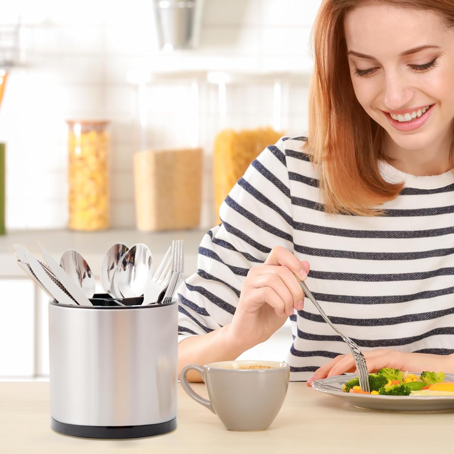 • 360° rotating silverware holder. The base of the flatware organizer, rotating smoothly without wobbling, makes it easy to access cutlery. 4 non-slip rubber feet help keep the silverware caddy from tipping when rotating, and prevent scratches on countertop
