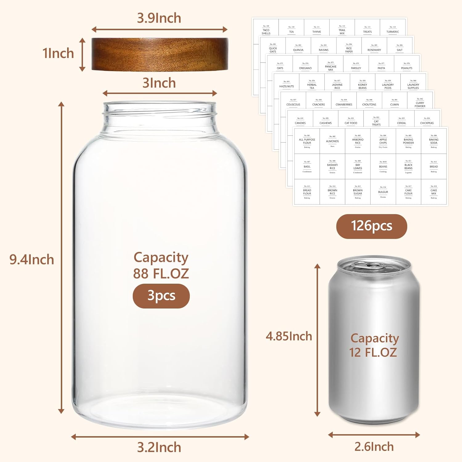 KEYWING 88oz Large Glass Jars with Airtight Acacia Wood Lids, Set of 3 Food Storage Containers for Flour, Sugar, Rice, Pasta, Cereal, Cookies – Includes 126 Labels