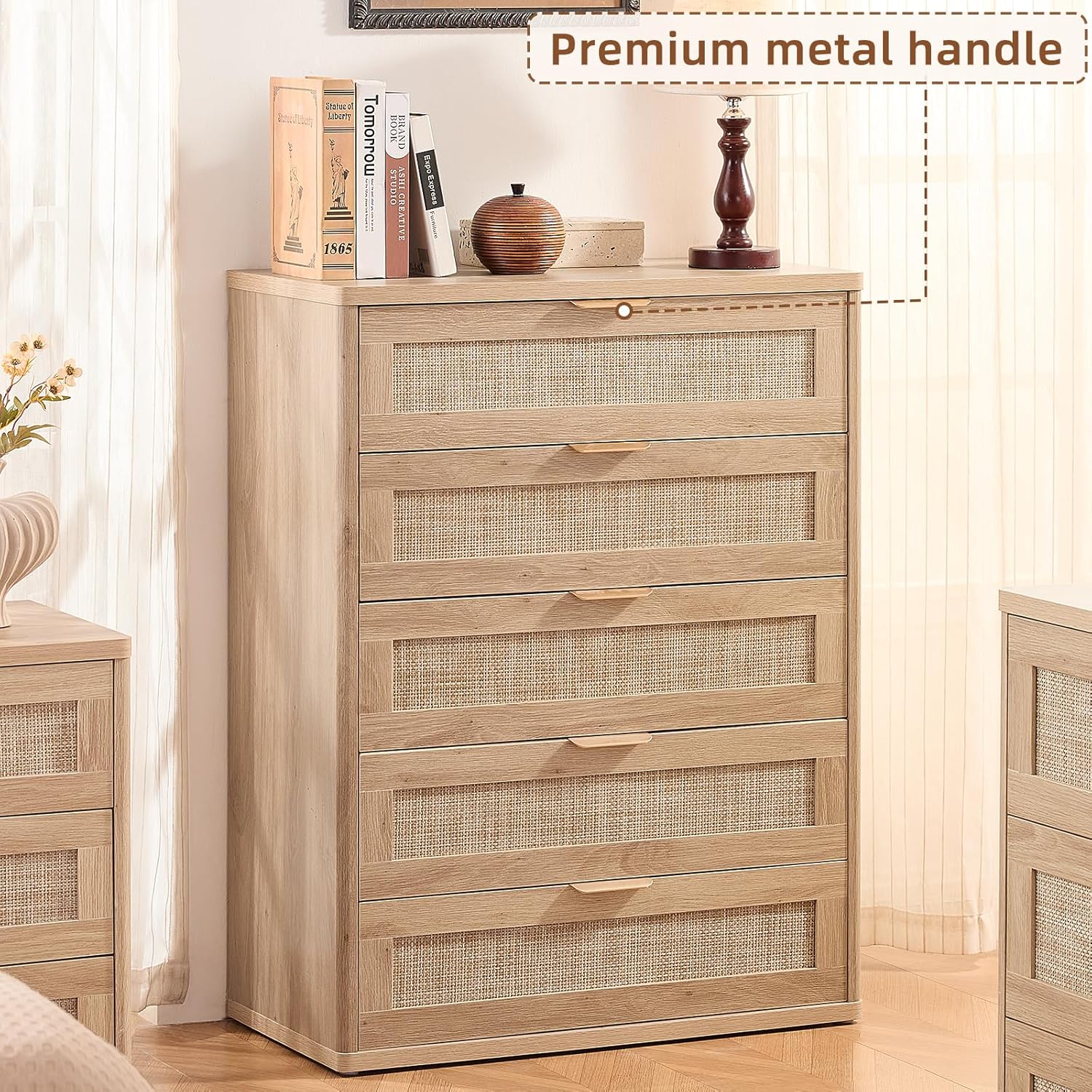 LEYAOYAO Rattan Dresser for Bedroom Set 2, 41" Tall Chest of Drawers, Modern 5 Drawers Boho Dressers with Storage, Light Oak Dresser Wooden Closet Organizer for Living Room, Hallway, Natural Wood