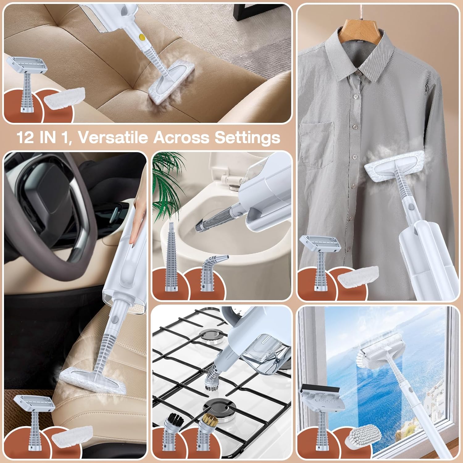 - 10-in-1 Multi-purpose Accessories and 350ml Water Tank: ScrubWiz steamer for cleaning equipped with 10 brush heads and 350ml water tank, steam mop not only simplifies floor and carpet cleaning tasks but can also be used for cleaning windows, clothing creases, gaps, stoves, sofas, grill and cars, providing a comprehensive cleaning experience