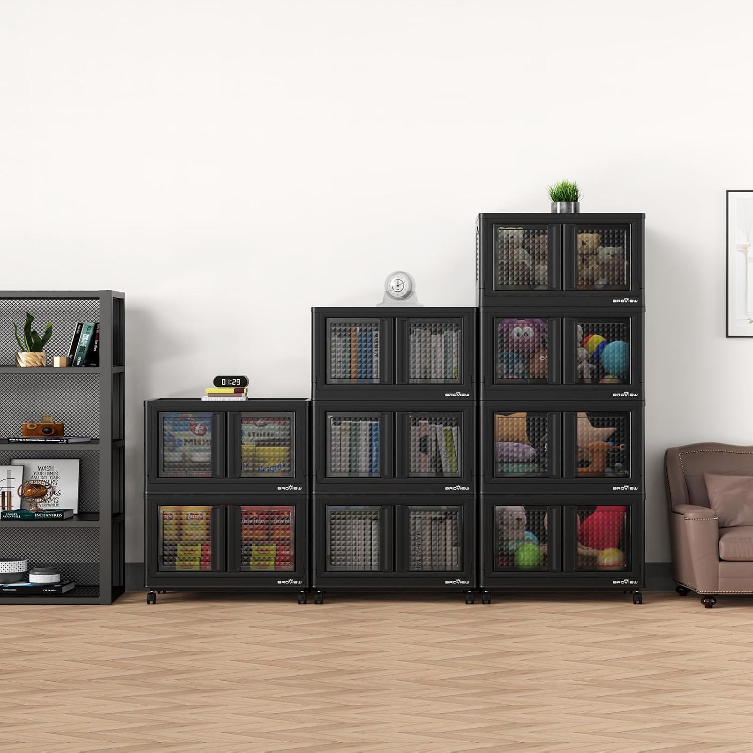 - 【Stackable and Foldable Design】 You can stack different numbers of plastic storage bins you want, such as bedside cabinets, clothes cabinets, bookcases, kitchen cabinets, etc. With roomy capacity, odorless, and foldable design, these storage containers are perfect for your closet organizer, laundry organizer, trunk organizer, garage tote, playroom storage, book storage shelves, classroom bins, and dorm storage box.