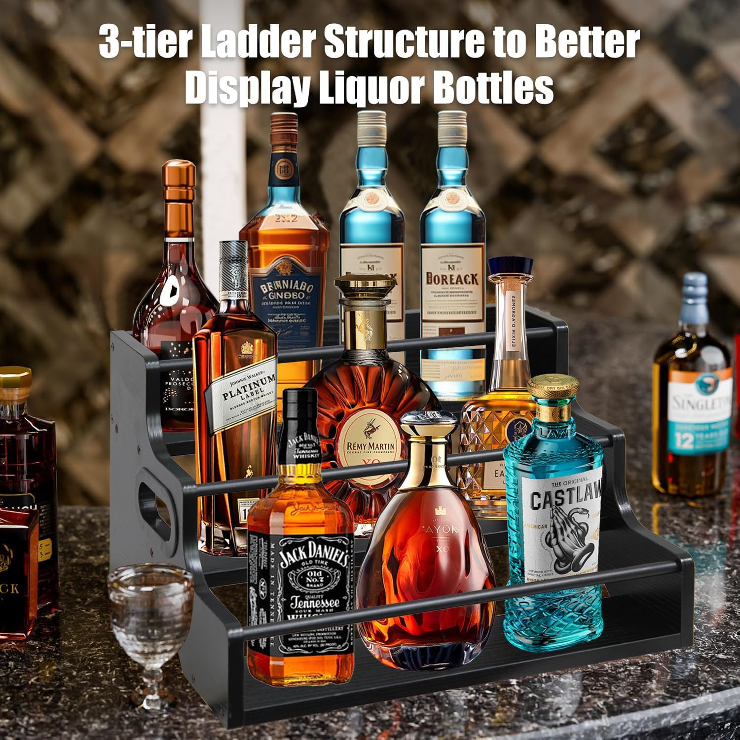 AT-VALY 3-Tier Spice Rack, Iron&MDF Kitchen Storage Shelf, Space-Saving Countertop Organizer for Spices, Herbs, Seasonings, Sturdy Stylish Condiment Holder,Countertop Wine Rack (Black Grain)