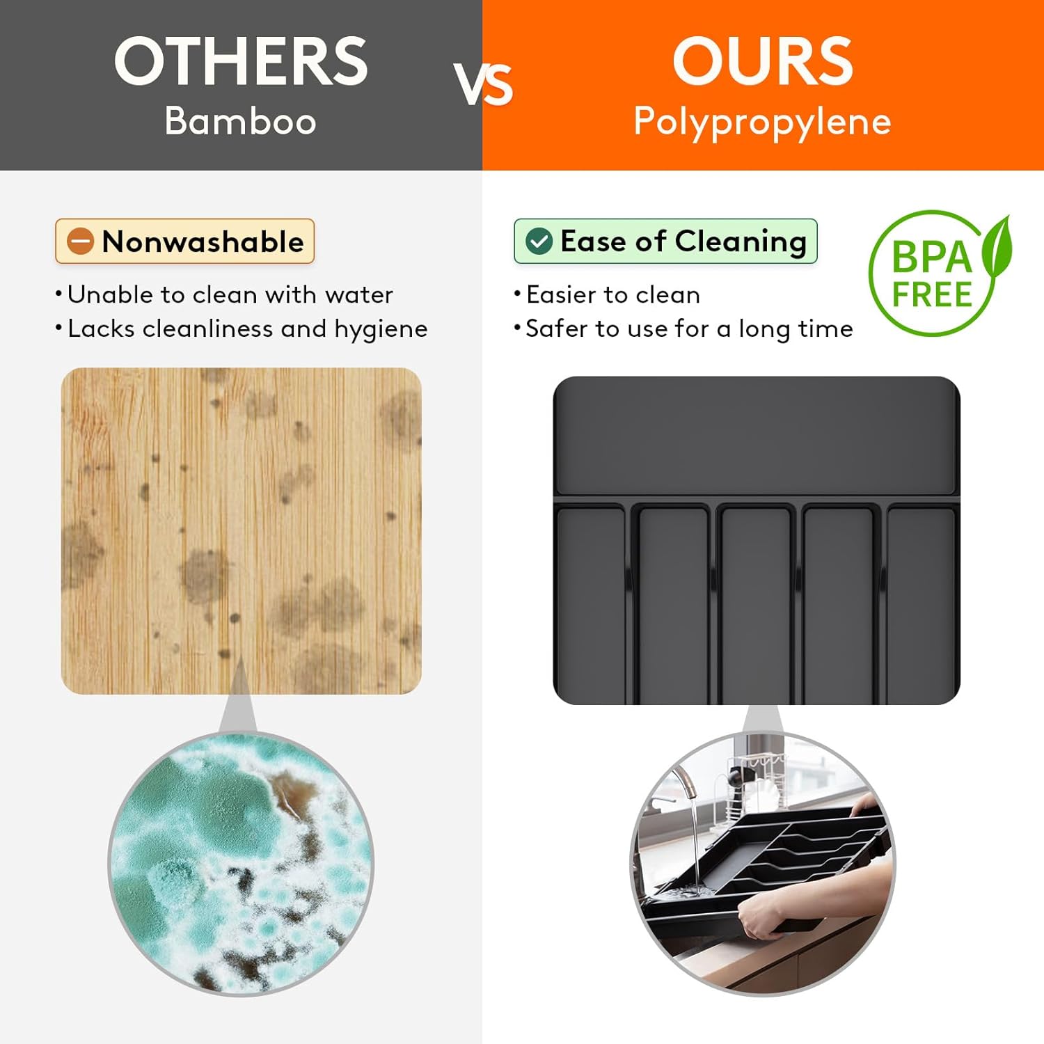 • Robust and Safe: This kitchen drawer organizer is crafted from premium PP material, BPA-free and built to last. It ensures your silverware is stored in a healthy, safe environment for worry-free use