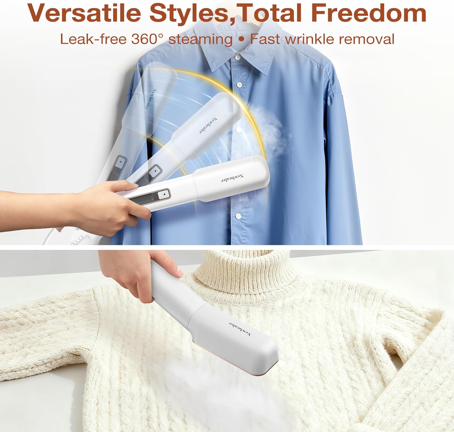 - [Your 2 in 1 Ironing Companion – No Board Required] Tackle all wrinkled clothes with this versatile tool: switch between steam for delicate fabrics like silk and dry ironing for deep creases, and use its 180° rotatable head to adapt to any angle—perfect for tricky spots, and no ironing board needed.