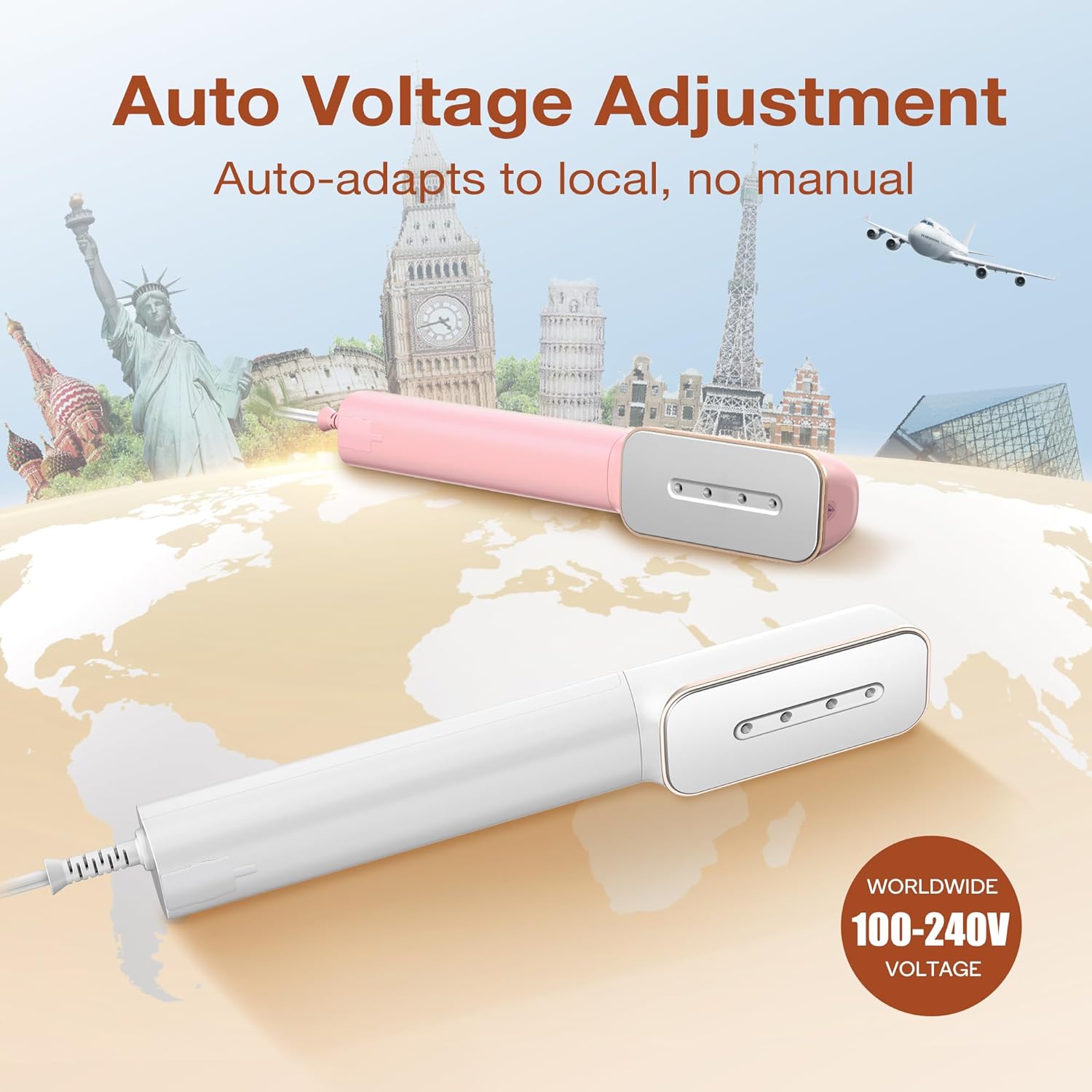 - [Global Voltage, Auto-Adjusting] Say goodbye to voltage hassles—this compact travel steam iron auto-detects and adapts to 100-240V global voltages. No adjustments needed,just plug in, steam up, and smooth out wrinkles anywhere your journey takes you.