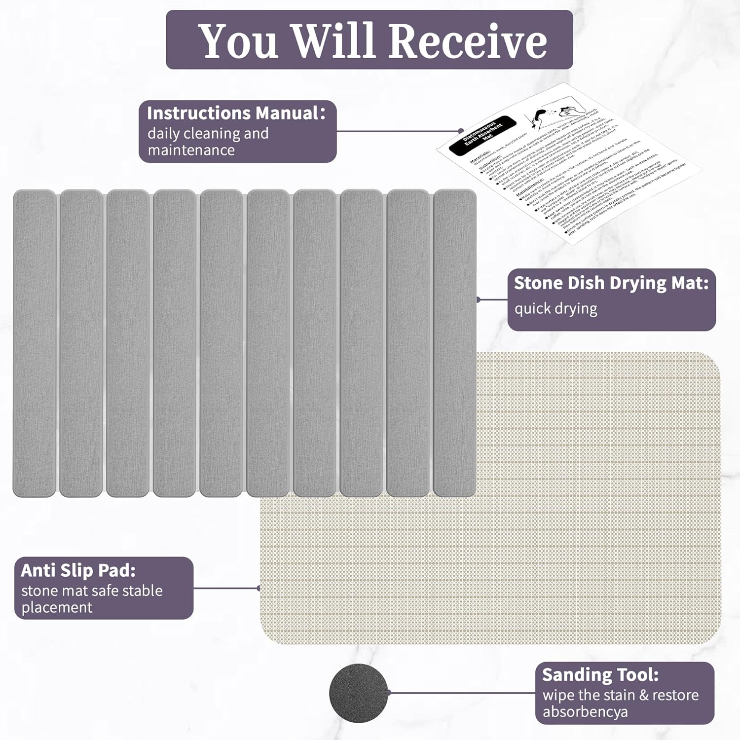 - 【Lightning-Fast Drying Performance】Tired of wet countertops? Our quick dry stone mat kitchen soaks up moisture instantly, thanks to its natural diatomaceous earth material. This stone drying mat dries dishes 50% faster than standard mats - perfect for busy kitchens and large dish loads!