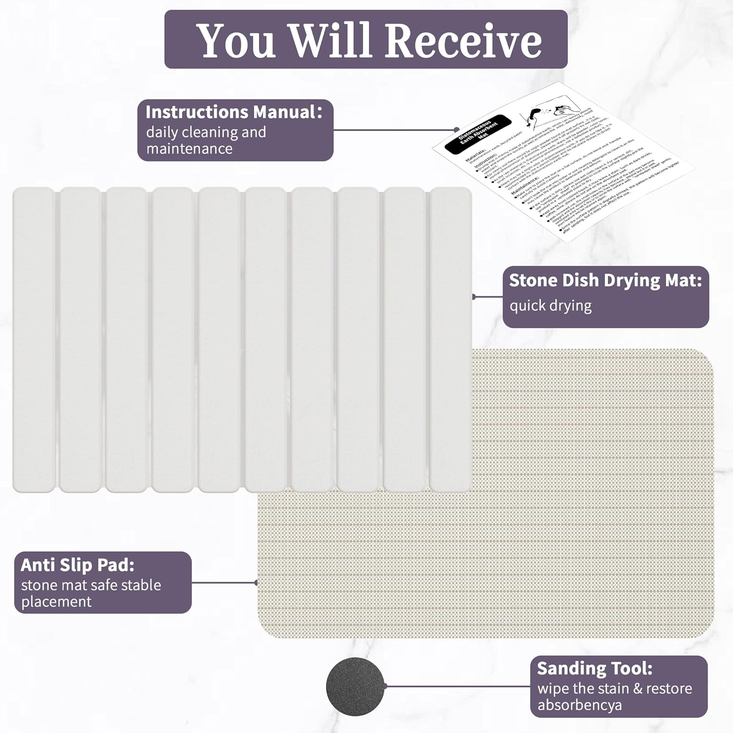 - 【Lightning-Fast Drying Performance】Tired of wet countertops? Our quick dry stone mat kitchen soaks up moisture instantly, thanks to its natural diatomaceous earth material. This stone drying mat dries dishes 50% faster than standard mats - perfect for busy kitchens and large dish loads!