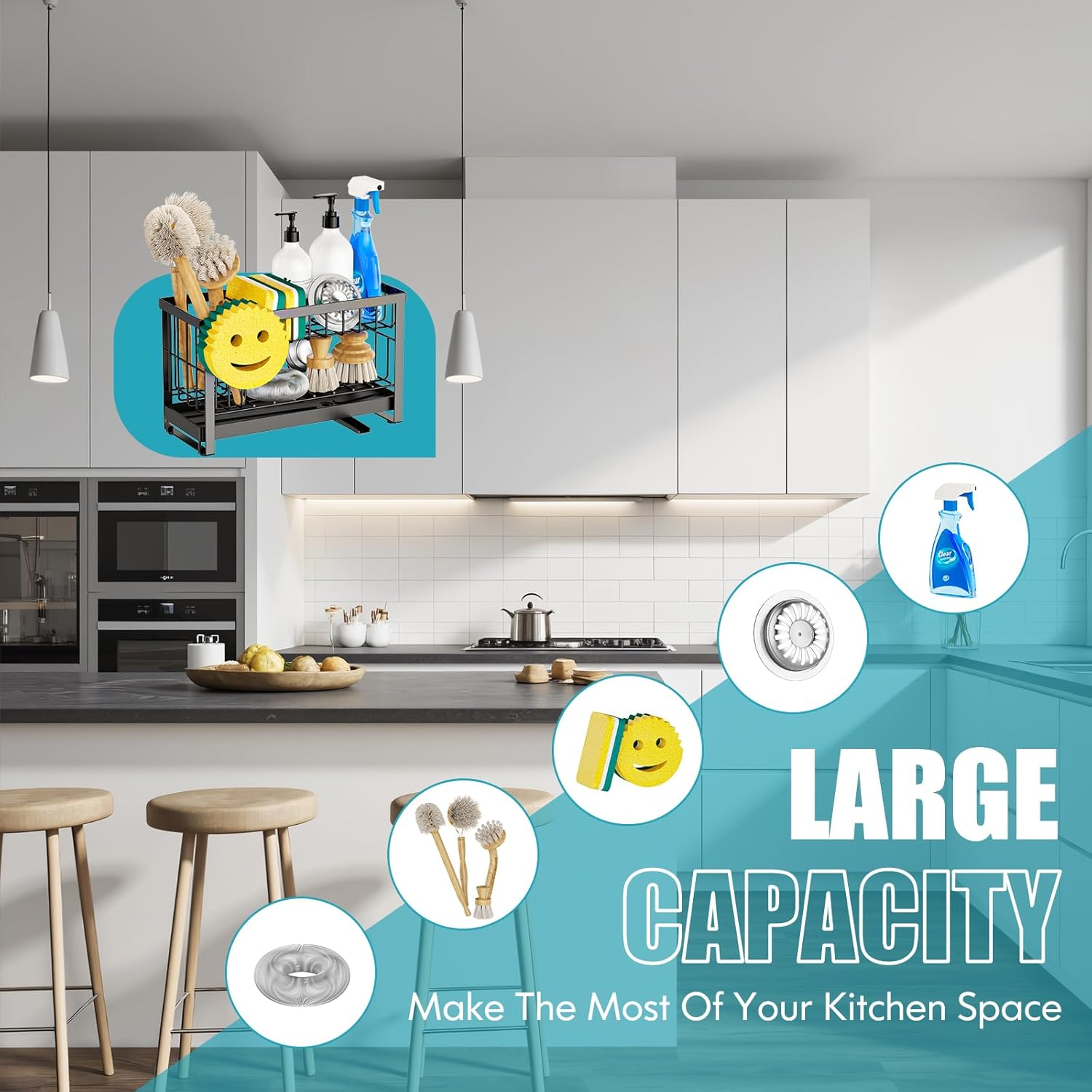 - DOUBLE-LAYER CAPACITY:The upgraded sponge holder comes with a 2 tier sink rack and a brush holder.Holds 2 soap dispenser,sponges,scrubber,sink stopper,steel wool etc.The added movable smiley sponge holder provides extra storage for your smiley sponge.It has a large capacity but occupies a very small space,making it suitable for kitchens with limited space and keeping sink countertops clean and tidy