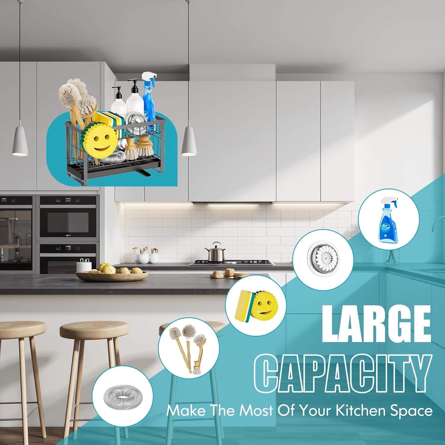 - DOUBLE-LAYER CAPACITY:The upgraded sponge holder comes with a 2 tier sink rack and a brush holder.Holds 2 soap dispenser,sponges,scrubber,sink stopper,steel wool etc.The added movable smiley sponge holder provides extra storage for your smiley sponge.It has a large capacity but occupies a very small space,making it suitable for kitchens with limited space and keeping sink countertops clean and tidy