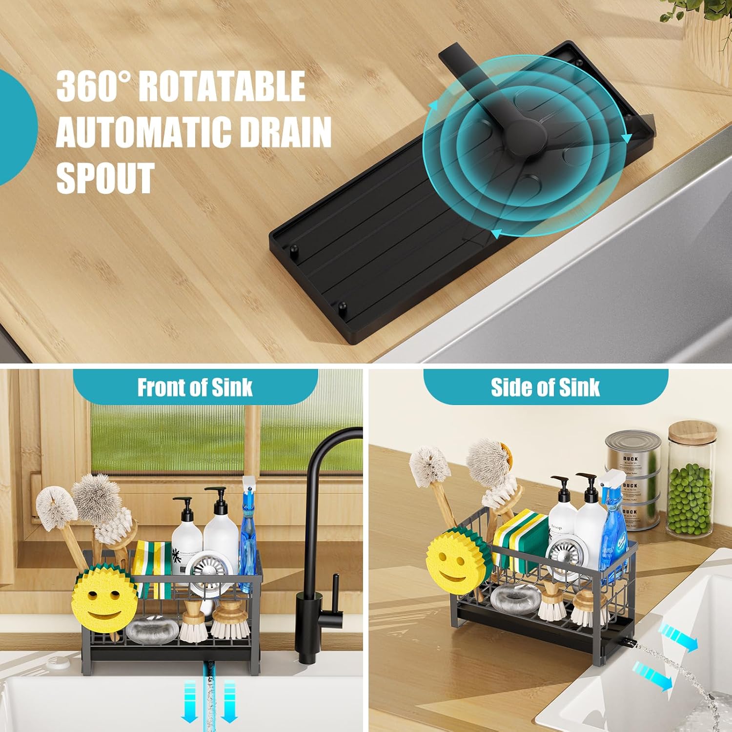 - 360° ROTATABLE SPOUT:This kitchen sink organizer comes with a rotatable spout,the spout can be that swivels in three direction.Water droplets on the sponge reach the removable water reservoir tray that the water in the sponge can be directed to the sink.There won't be any water left on the countertop,you don't need to pull out the drip tray to clean it often,reducing the workload in the kitchen,saving your cleaning time