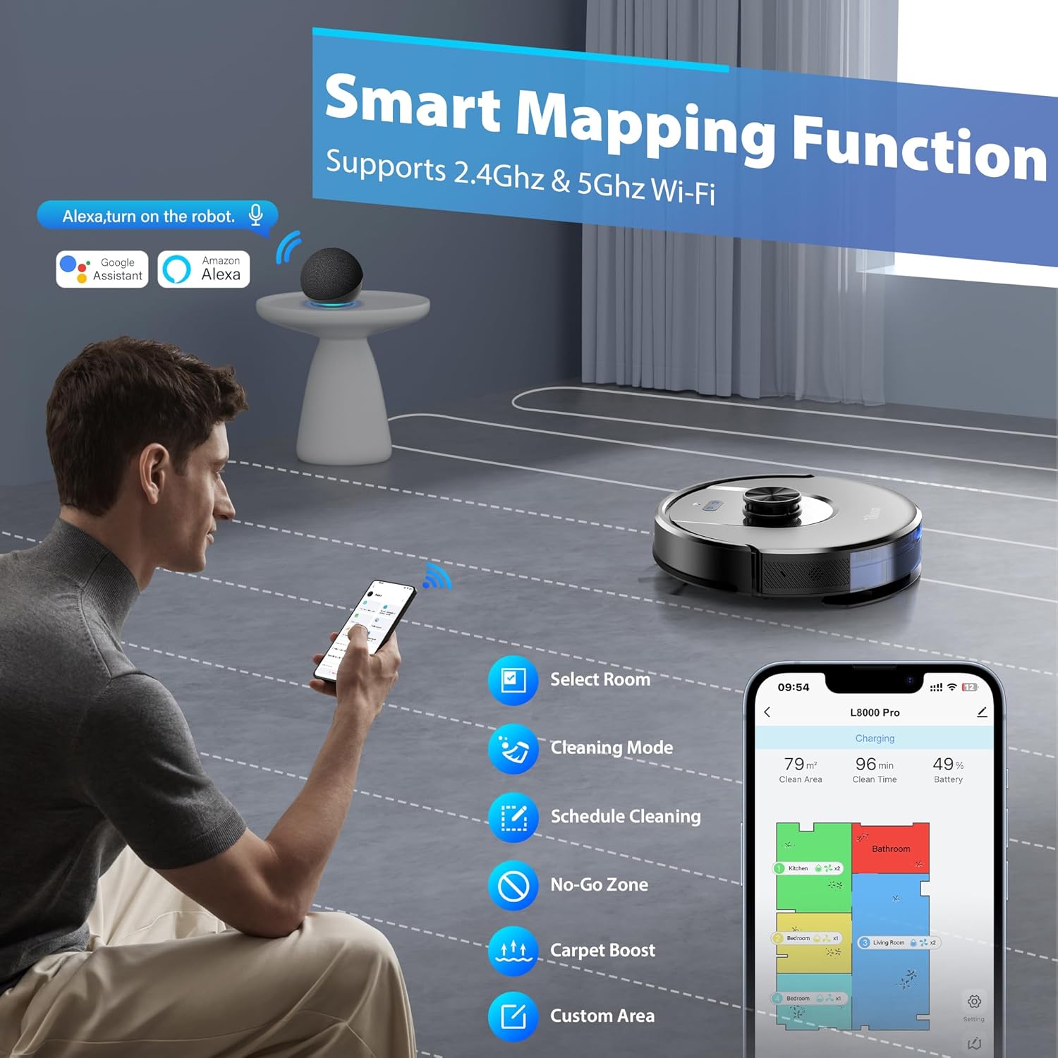 - Convenient App Control: Use the app to remote control the Tikom L8000 Pro vacuum cleaner from anywhere. Customize your cleaning by setting different suction and water levels for various areas based on your needs. Easily designate Restricted Area(No-Go Zones, No-Mop Zones,& Virtual Walls) to avoid unnecessary work. It also can work with Alexa & Google Home