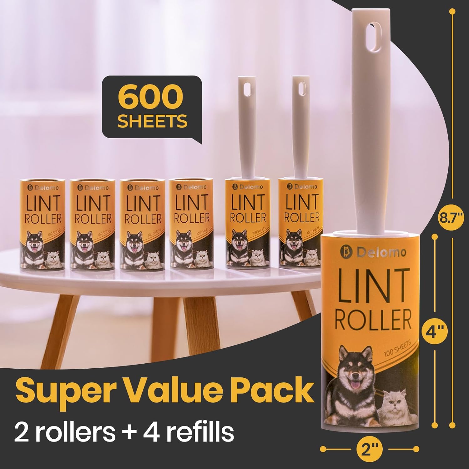 DELOMO Lint Roller 600 Sheets (2 Rollers + 4 Refills) - Lint Rollers for Pet Hair Extra Sticky, Mega Value Pet Hair Removal Tool for Clothes/Couch/Furniture/Car - Keep Your Home Tidy