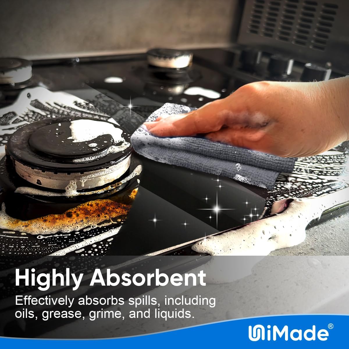 • Powerful Cleaning: Unimade commercial grade microfiber cleaning cloths boast exceptional cleaning power, tackling messes with ease. From spills to stains, they deliver a thorough clean every time. Say goodbye to stubborn stains and spills with our shop towels