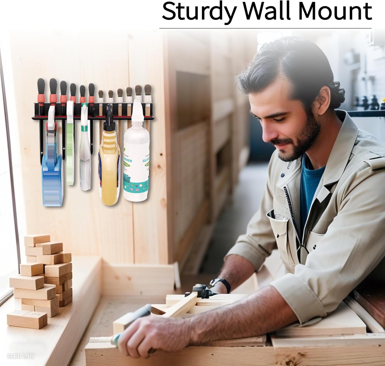 Wall Mount Brush & Spray Bottle Holder Combo Rack for Garage, Detailing Organizer with Mounting Hardware - Holds 12 Brushes & Hanging Rail for Bottles