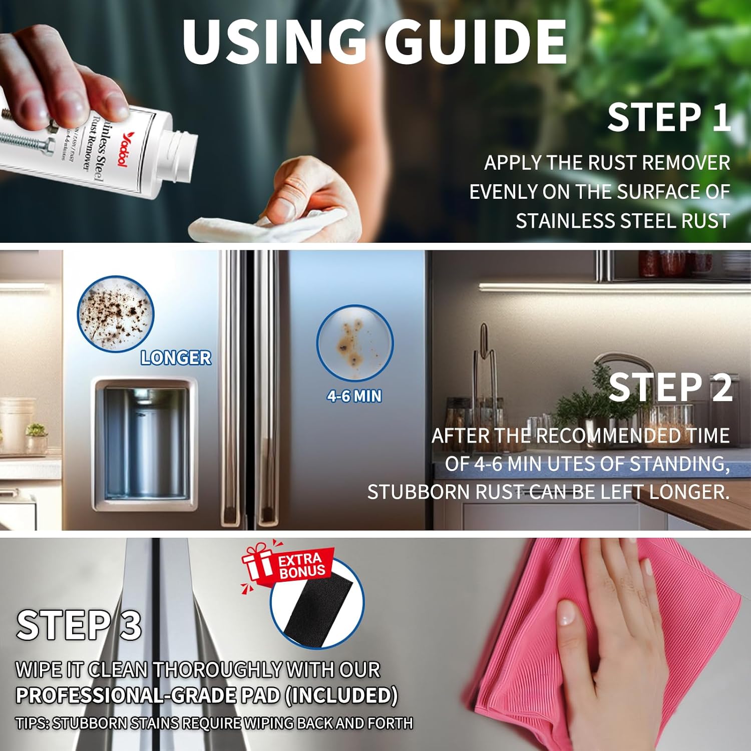 • EFFORTLESS USAGE: Simply apply, let stand for the recommended time of 2-3 minutes, and then rinse. No need for laborious scrubbing, saving time and effort. Rust removal and maintenance can extend the service life of stainless steel appliances, and long-term use is more cost-effective