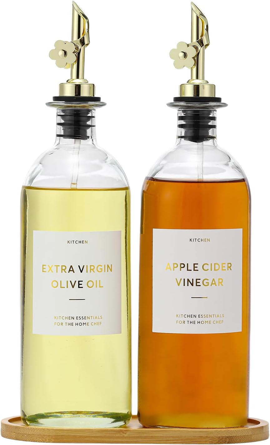 • KITCHEN OLIVE OIL BOTTLES – The oil and vinegar dispenser set contains 2 transparent 16oz (500ML) glass bottles, 2 gold stainless steel oil spouts, 17 gold waterproof labels(kinds of oil and vinegar) and a bamboo tray, Ideal for safely store and dispense your olive oil and vinegar.