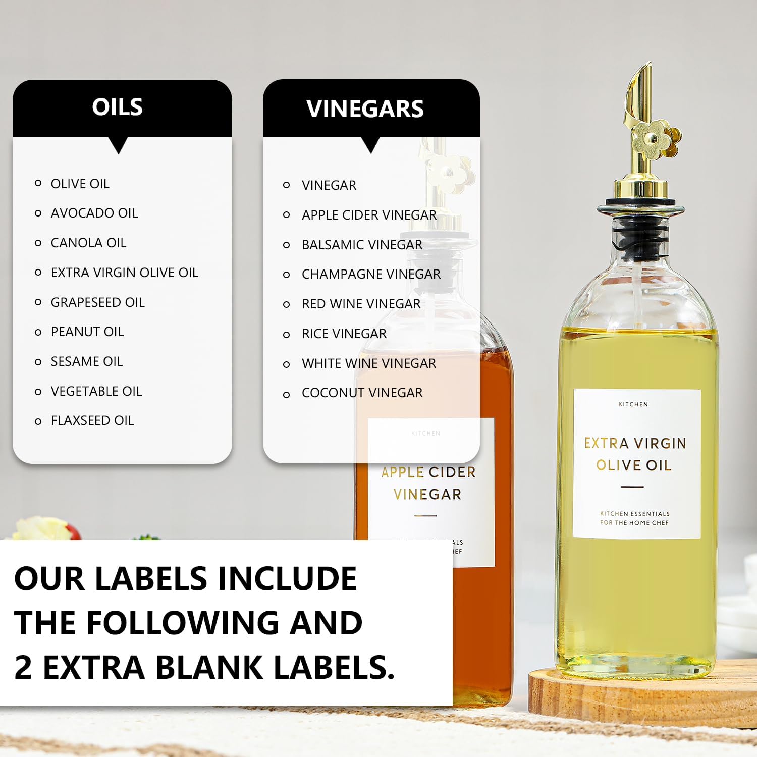 • KITCHEN ESSENTIAL - Worthy of sitting on your kitchen counter, The olive oil bottle for kitchen with label which can help you identify them easily, both decorative and practical, this oil dispenser bottles not only kitchen oil dispenser, but also kitchen décor.