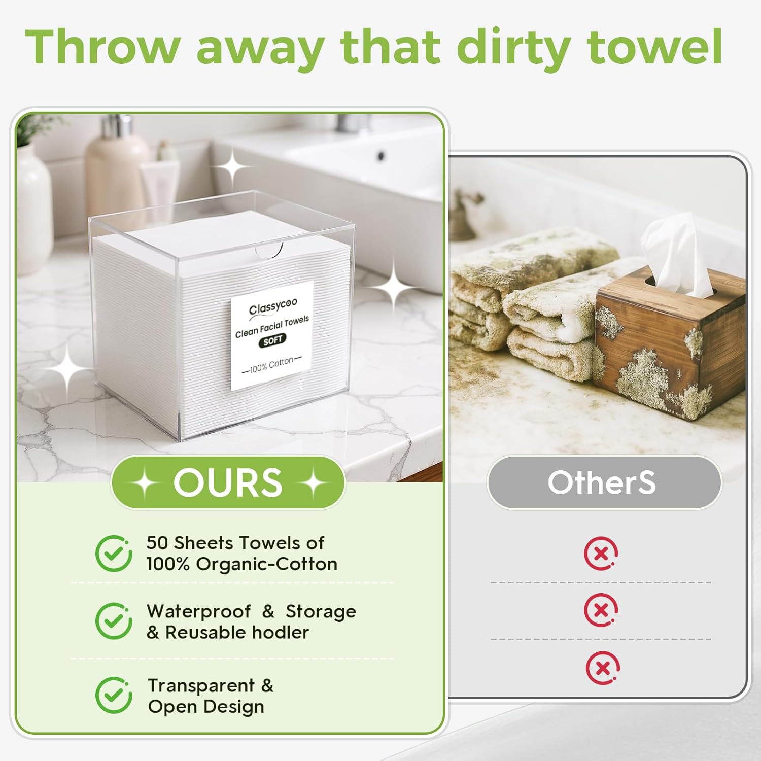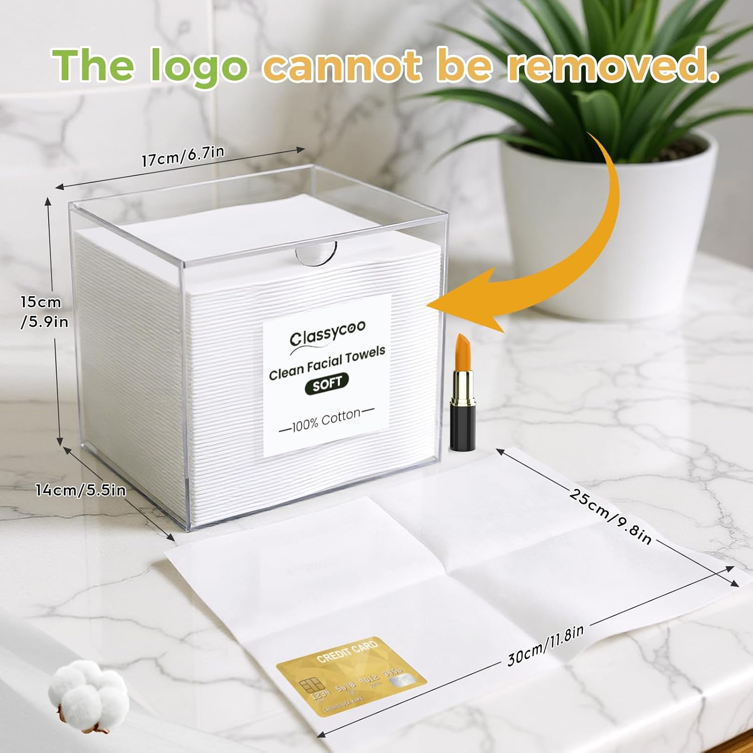 • 100% Cotton Facial Wipe & Premium Acrylic Material: 6.7"L x 6"W x 5.51"H, the face towel holder is compatible with CLEAN SKIN CLUB, Classycoo, etc. Note: Includes 50 PCS Facial Towels! This logo tag cannot be removed!