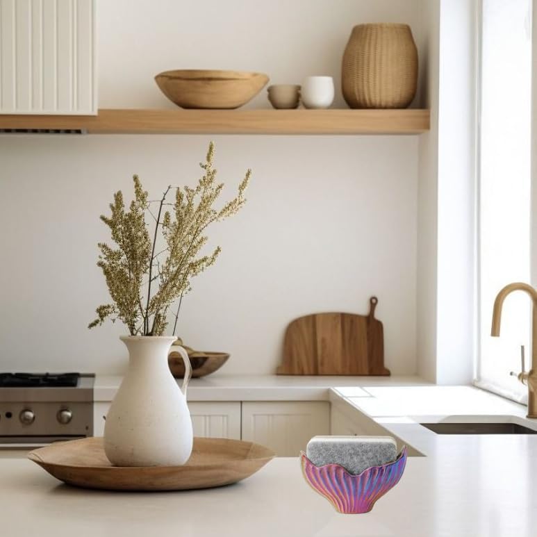 • 【Sized for Sponges】 This sink sponge holder measures 3.4 in tall, 2.2 in wide, with a 5.7 in slot—perfect for most standard sponges. It also offers a unique double-sided design with two style options, including one side that shimmers with iridescent rainbows and another that features an elegant blue and silver finish, allowing you to effortlessly complement your kitchen’s decor.