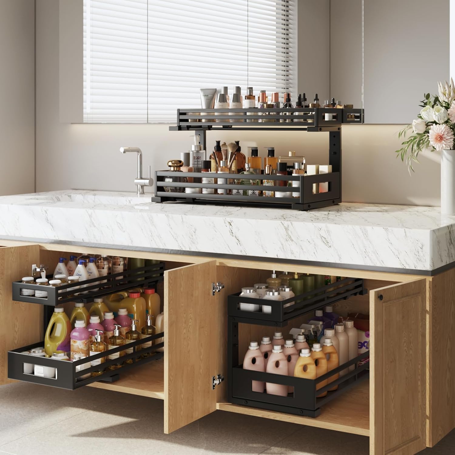 2-Pack 20.47"Deep Under Sink Organizer And Storage,2-Tier L-Shaped Pull Out Cabinet Organizer with Upgraded Slide Rails,Height Adjustable Drawers for Kitchen&Bathroom,Extra-Large Storage Shelves–Black