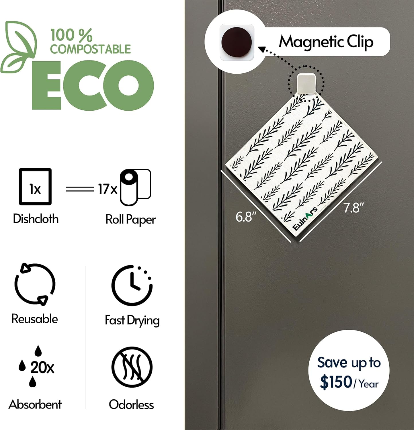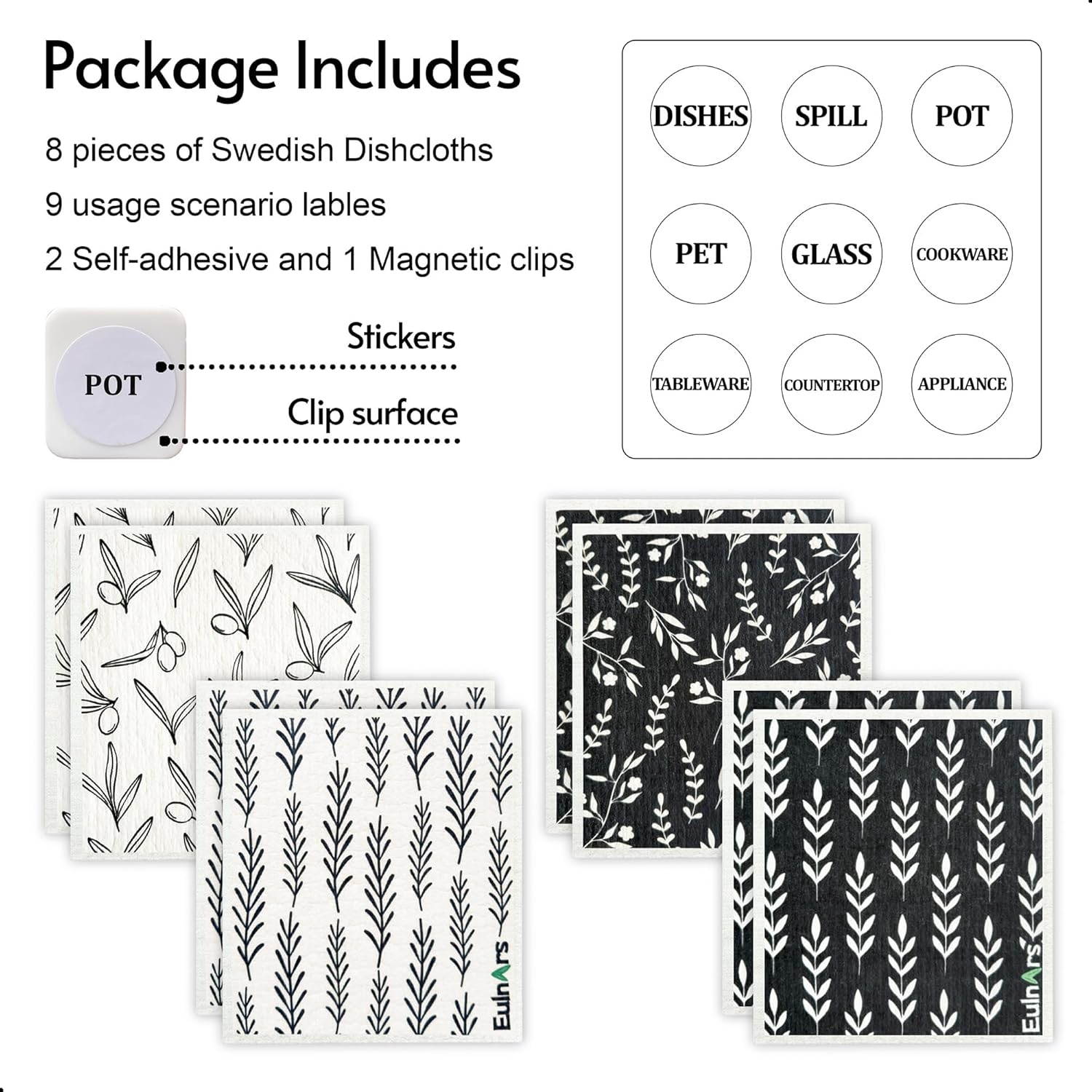 • Easy to Clean and Store: Our swedish dish cloths, measuring 7.8 x 6.8 inches, each set comes with 8 cellulose dish cloths in 4 styles, along with 2 self-adhesive clips, 1 magnetic clip, and 9 labeling tags. Customize storage for easy access, hanging them on walls, counters, or refrigerators to keep your kitchen organized