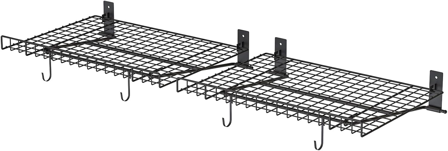 - SPACE-SAVING & FOLDABLE DESIGN: This set of 2 garage wall shelves includes 4 metal hooks, screws, and expansion anchors. Our foldable garage shelves easily collapse against the wall when not in use, freeing up valuable space and providing convenience exactly where you need it. Ideal for small areas, they offer versatile storage solutions without compromising on functionality.
