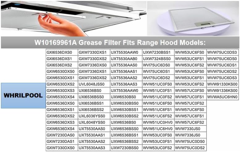 - Perfect Fit for Major Range Hood Models:Compatible with popular brands like Whirlpool, KitchenAid, and JennAir, including models **GXW6530DXS, JXT6030ADR0, IHW6302VM0**, and more (see full list in images). Replacement part numbers: **W10169961, W10870878, AP4482237**. Confidently order knowing this filter fits seamlessly—no tools required for installation!