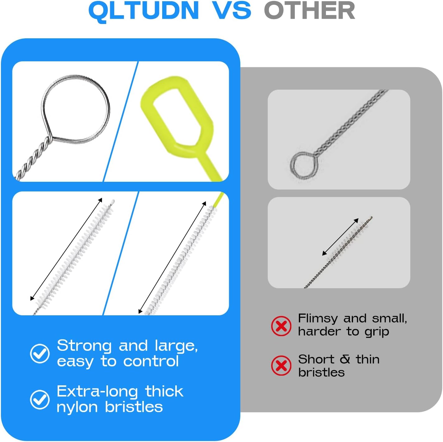 • Thicker Bristles, Deeper Clean: Thick, food-safe nylon bristles deliver serious scrubbing power without scratching or shedding. Reinforced with flexible, spiral-wound 304 stainless steel core, this heavy-duty straw cleaning brush bends without breaking—built to outlast cheaper kits