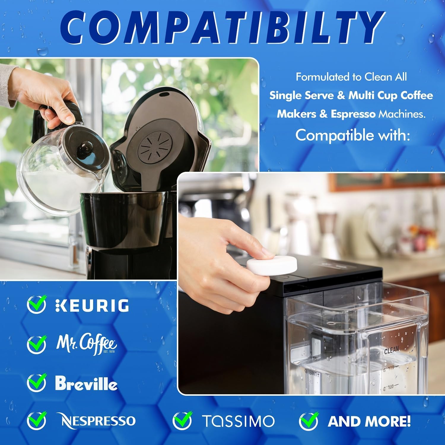 • 3X Cleaning Power: One large tablet delivers the cleaning power of 3 doses of standard liquids, powders, or small tablets. Engineered for slow dissolution, our heavy-duty formula penetrates deep to eliminate tough buildup—limescale, coffee oil residue, hard water deposits, and other mineral buildup—unlocking coffee's full flavor potential.