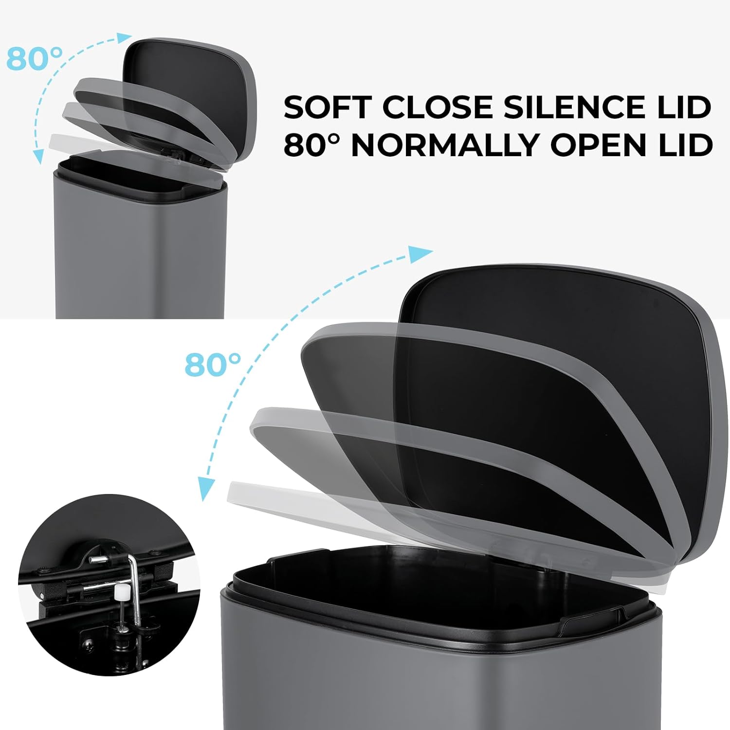 • Quiet Closing&Lid-lock: Heavy-duty garbage can is built with integrated step pedal mechanism and the force damper, which soft open and close lid while preventing slamming and banging. Lid-lock can help keep trash can open without stepping if you are inconvenient to keep stepping on pedal.