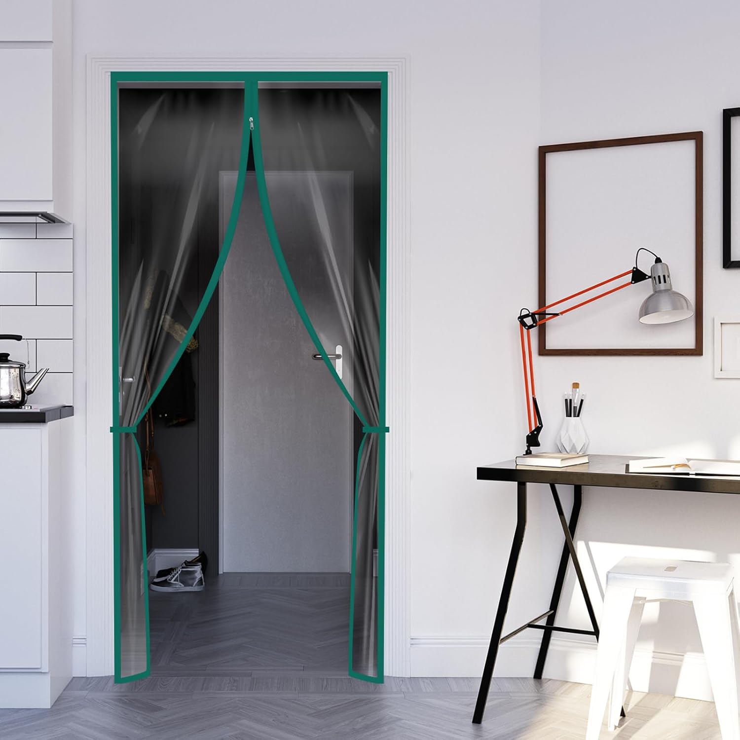 - Fresh Green Trim with Double Zippers: measuring 48 x 87 inches/122 x 221 cm, this green-trim EVA zipper curtain is ideal for standard residential doors and interior thresholds; It fits snugly for efficient dust, wind, and pet barrier performance without occupying extra space