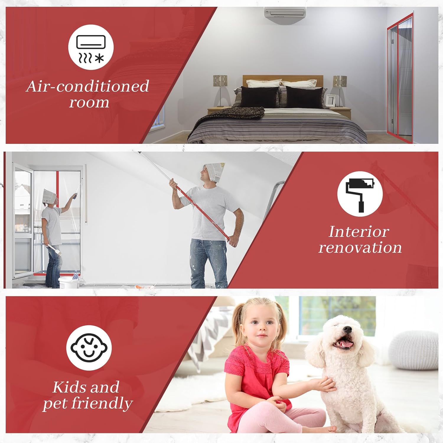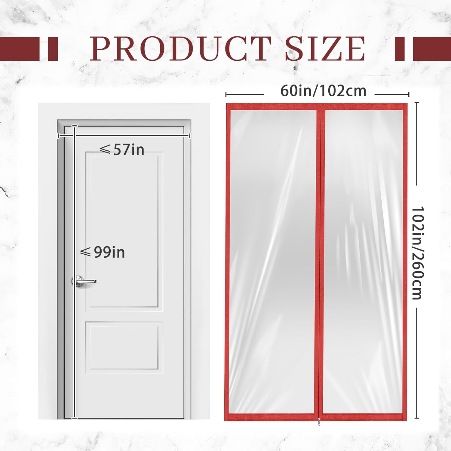 - Bold Red Edge with Dual Zippers: designed in an upgraded 60 x 102 inches/153 x 260 cm size, this variant features an eye-catching red trim with double-sided zippers for convenient access from both sides, perfect for wider or taller entryways such as warehouse doors, patio entries, or sliding glass doors; Its extended size offers greater dust and wind control