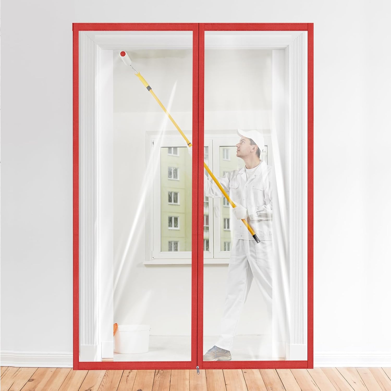 Amylove Zipper 60 x 102 Inch Dust Barrier Kit Red Edged Temporary Construction Door Barrier 5 x 8.5 ft Reusable Plastic Curtain Cover Containment Doorway Wall Screen Sheeting for Bathroom Hallway