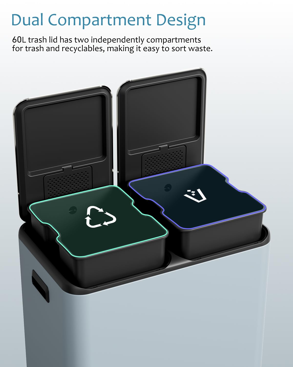 • 2 Removable Inner Buckets: Dual compartment trash can offers separate bins for different types of waste. Each compartment has its lid, which allows you to sort waste efficiently. With a generous capacity of 2 x 8 gallons, combo garbage bin meets your daily needs