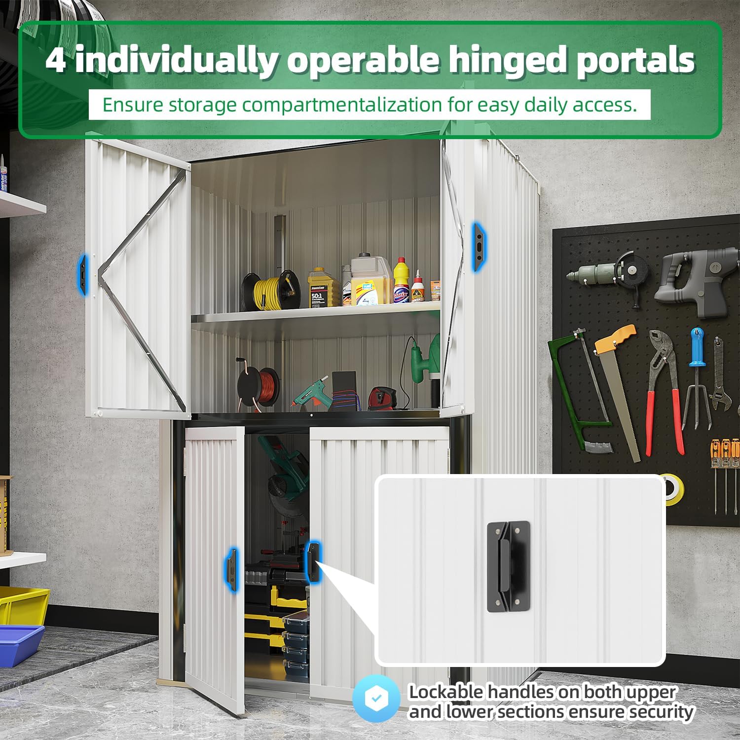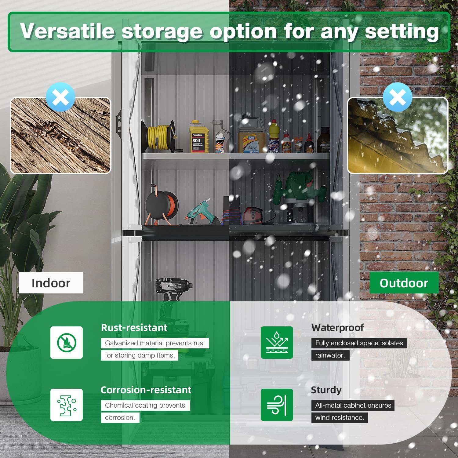 • Weatherproof Outdoor Cabinet: Fully sealed for outdoor storage waterproof protection and made from high-quality metal, weighing 95 lbs and capable of withstanding strong winds. It combines the benefits of traditional wooden and resin sheds, making it suitable for both indoor and outdoor use.