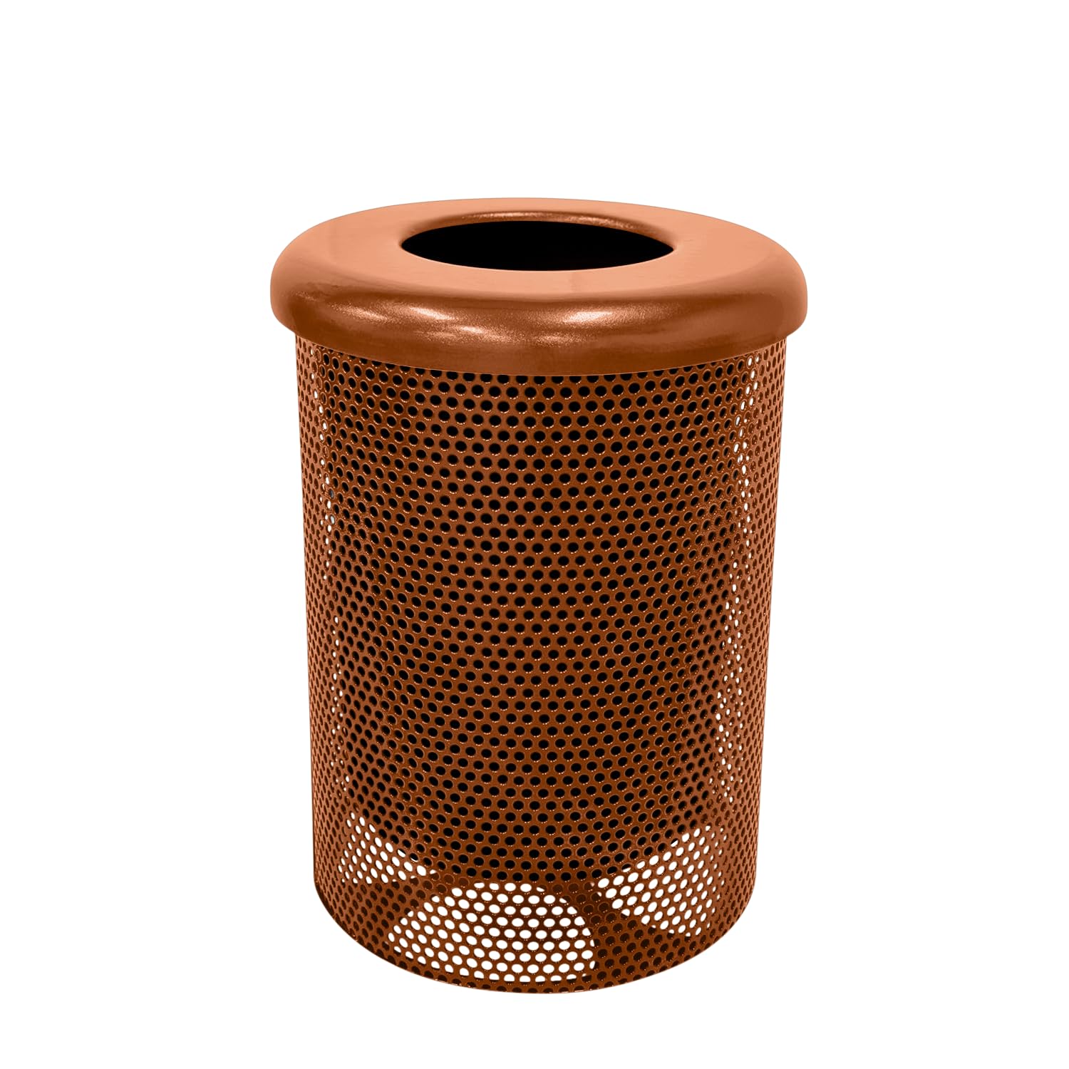 COATEDOUTDOORFURNITURE 32-Gallon Heavy-Duty Punched Steel Round Trash Receptacle, Commercial Outdoor Waste Bin with Liner & Black Flat Top Lid – Made in America (Textured Copper)
