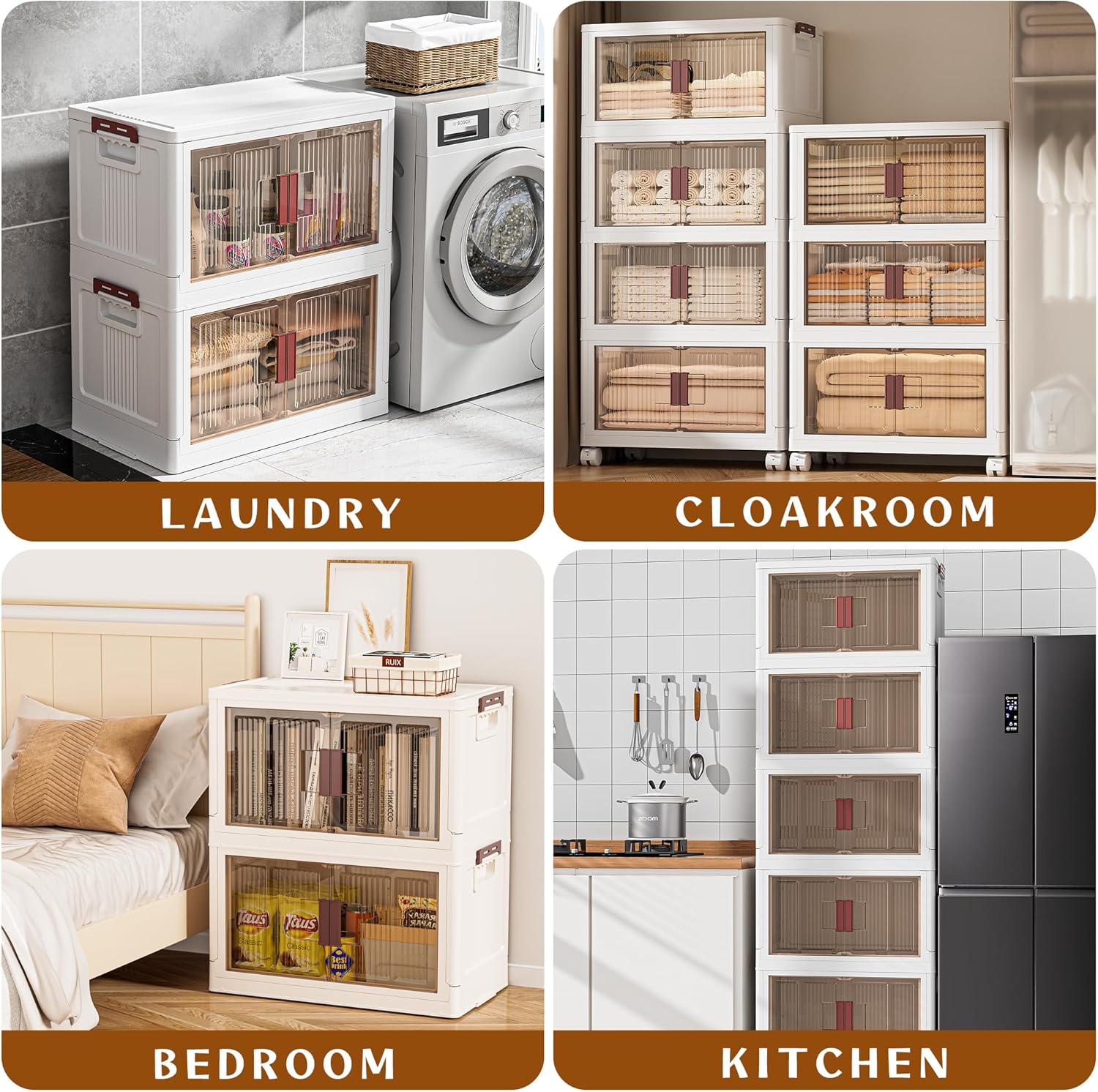 60GAL/240QT 4 Tier Large Stackable Storage Bins with Lids and Wheels, Collapsible Storage Bins Plastic with Doors, Suitable for Clothes, Closet, Home and Office