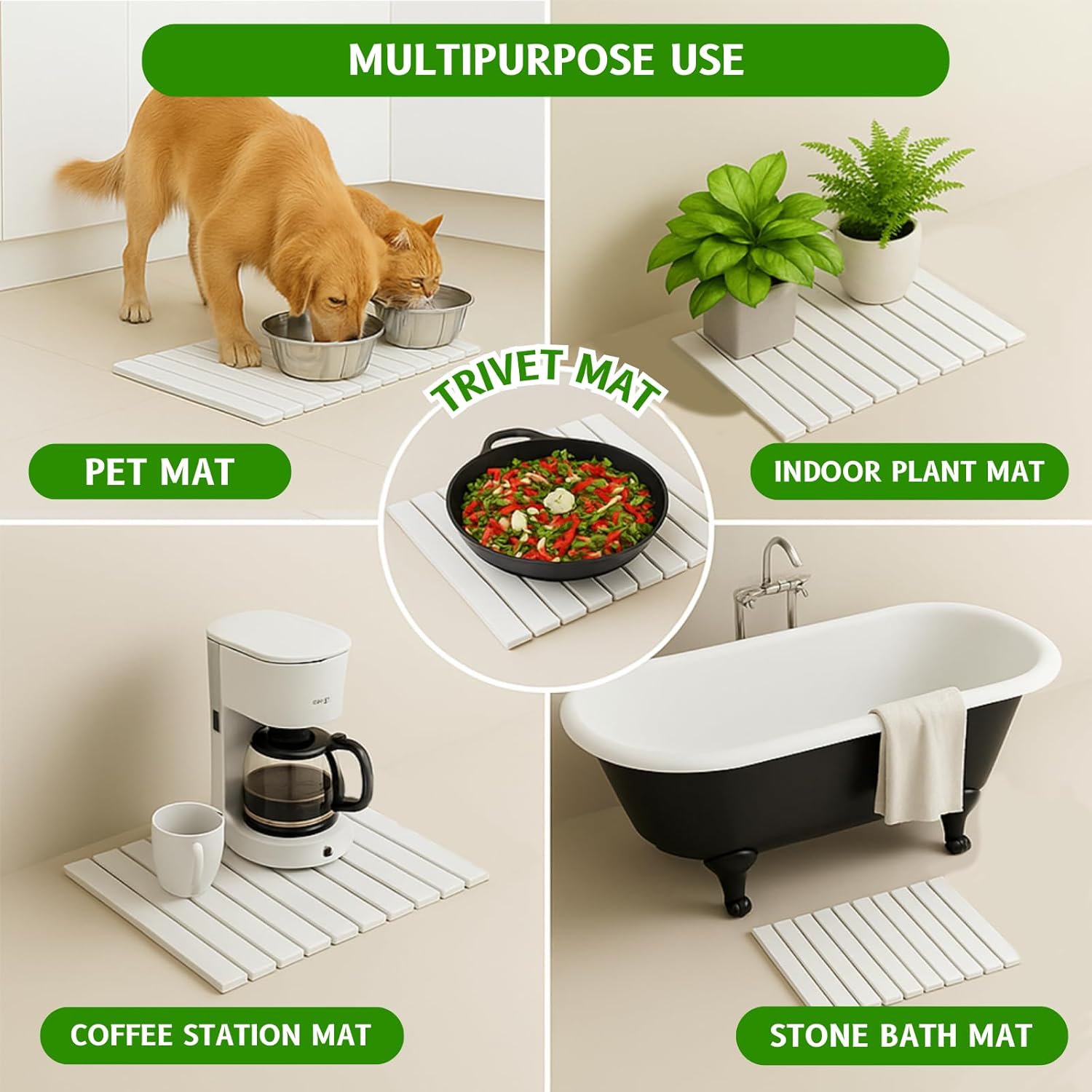 • Large 24" × 16" Multipurpose Mat – Foldable & Space-Saving Generously sized to hold dishes, pans, and utensils, yet foldable and compact for easy storage. Beyond the kitchen, use it as a bath mat, heat-resistant trivet, plant saucer, or pet feeding mat.