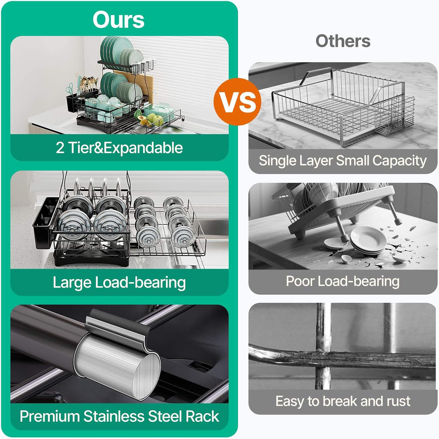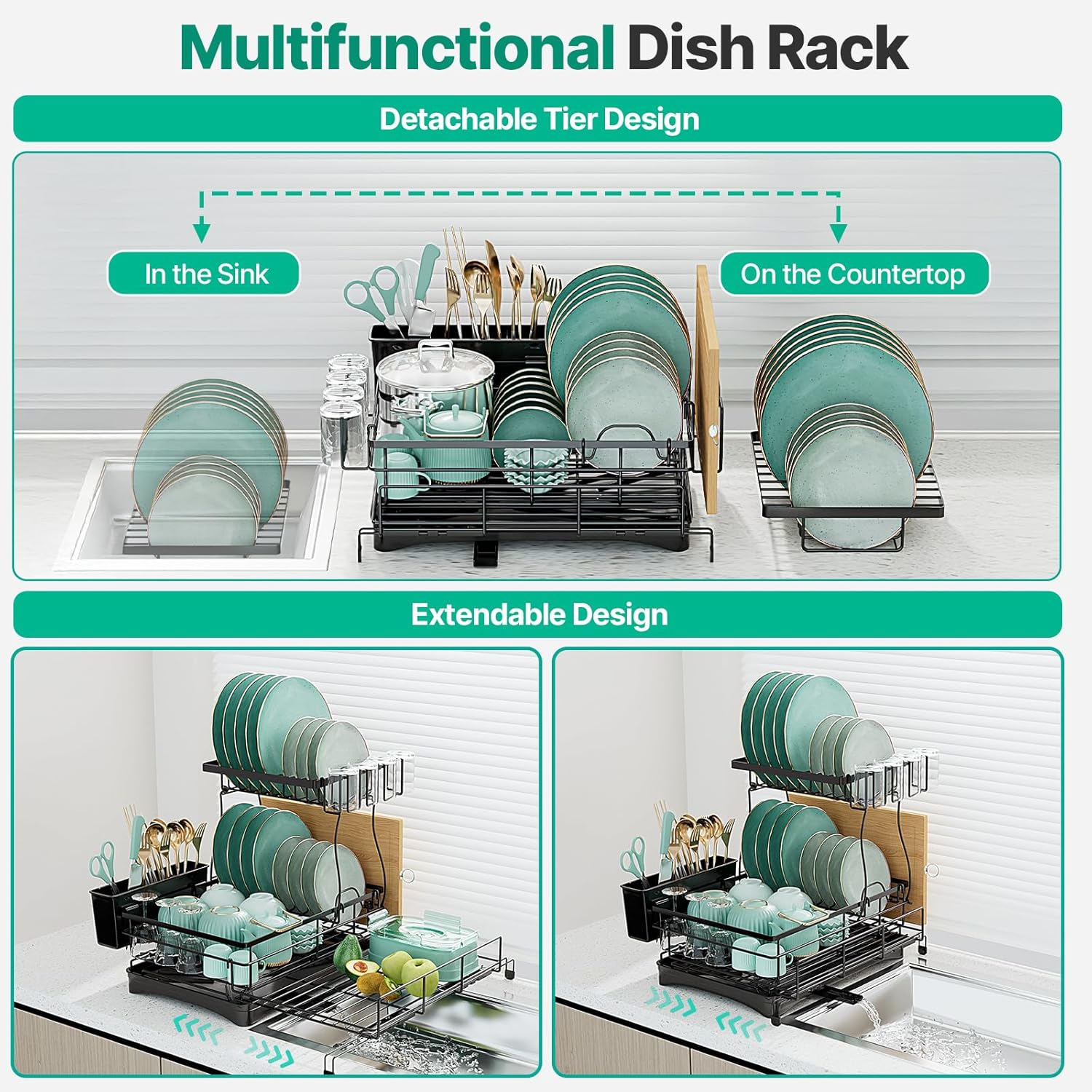 2 Tier Expandable Dish Drying Rack, Large Stainless Steel Dish Drying Rack Drainers for Kitchen Counter, Upgrade Dish Drainer with Utensil Holder, Drainboard & Cups Holder, Anti-Rust & Space Saving