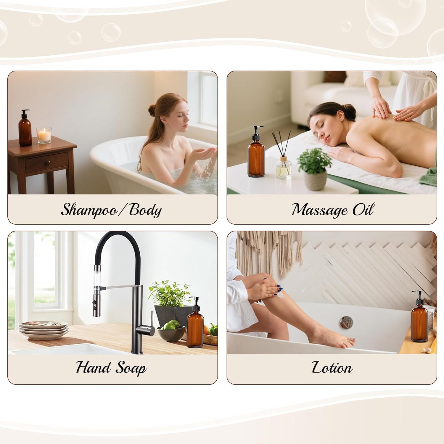 • Compact 8oz Amber Pump Bottle: These 8oz amber glass bottles with pumps are ideal for hand soap, essential oils, sanitizer, or facial cleanser. Their compact size makes them perfect for guest bathrooms, office sinks, or skincare travel kits.